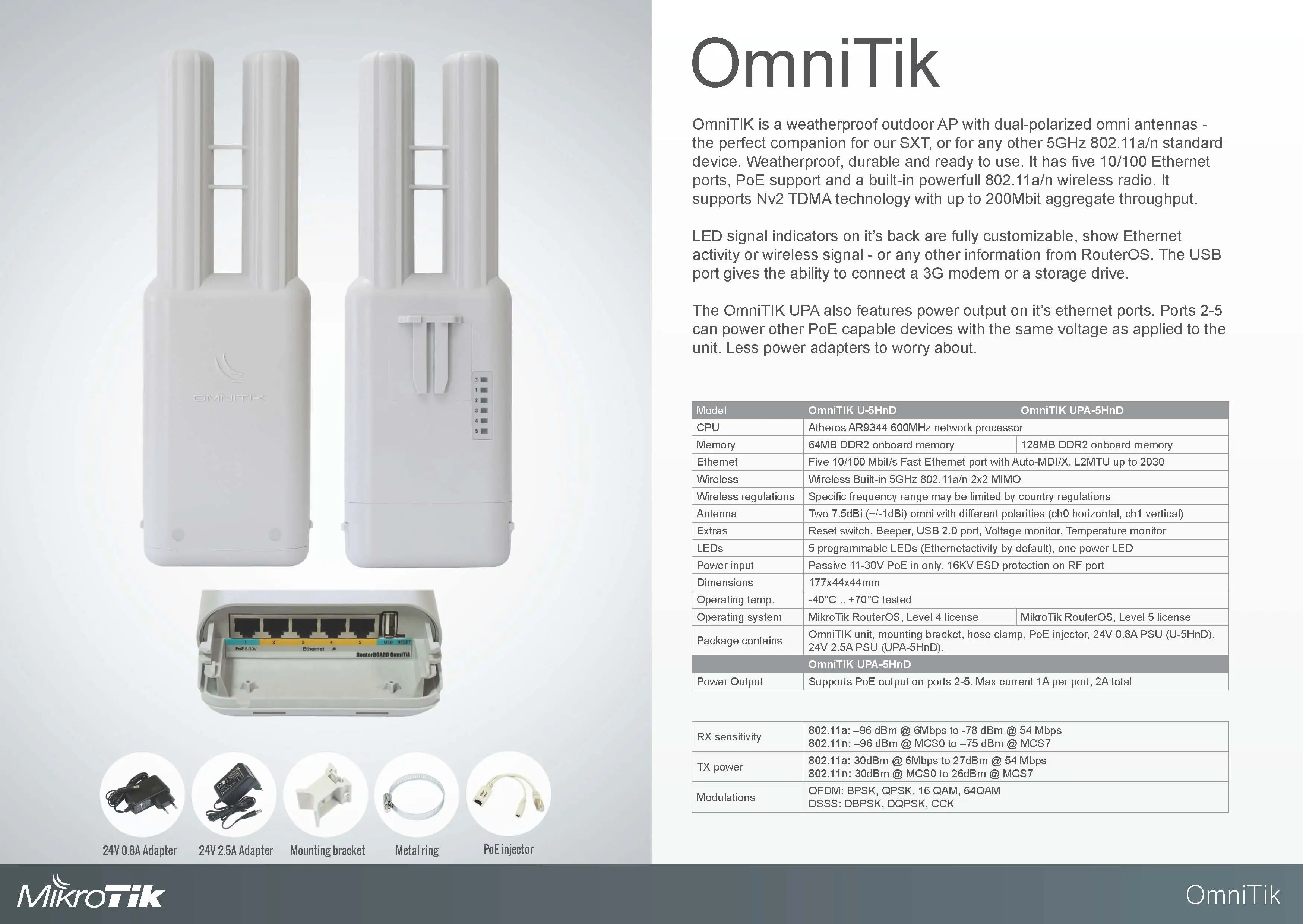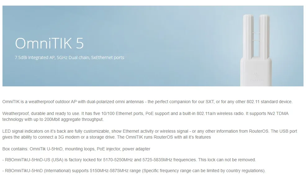 MikroTik RBOmniTikU-5HnD OmniTIK 5 Outdoor WiFi AP, 7.5dBi Integrated AP, 5GHz Dual Chain, 5xEthernet Ports, Wireless Bridge