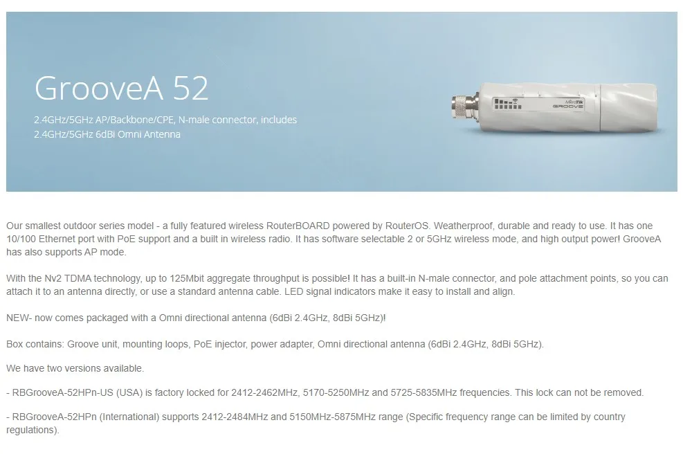 MikroTik RBGrooveA-52HPn GrooveA 52 2,4GHz/5GHz AP/Backbone/CPE, conector N-macho, incluye antena omnidireccional de 2,4GHz/5GHz 6dBi