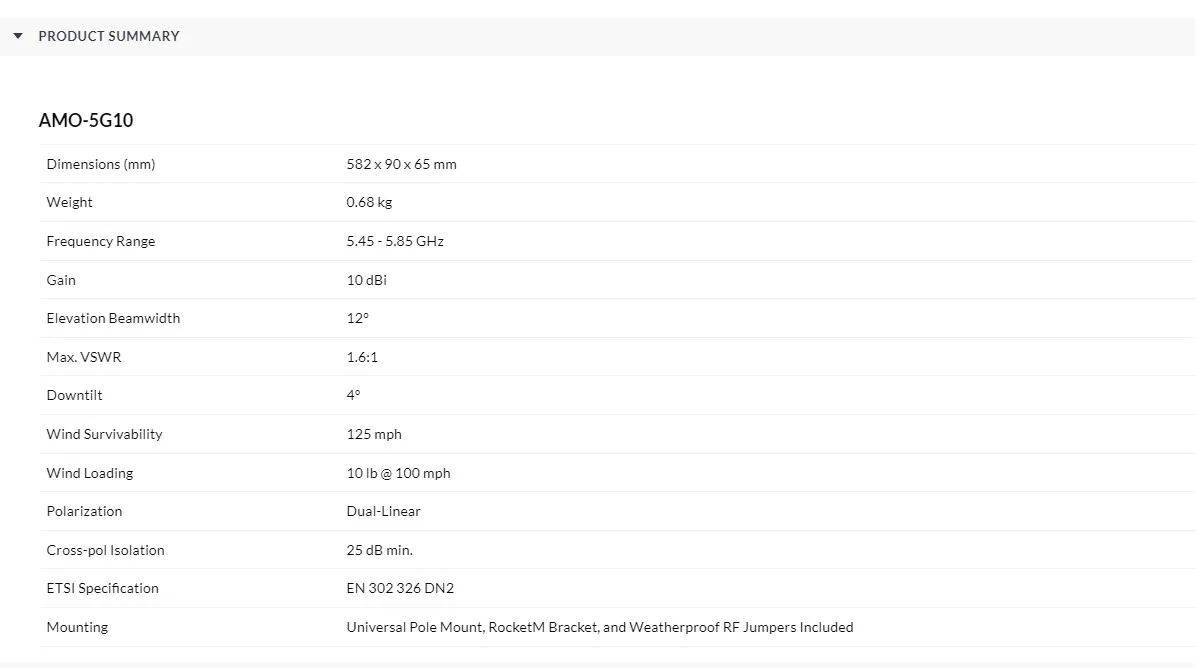 UBIQUITI AMO-5G10 UISP airMAX Omni 5 GHz, 10 dBi Antenna 2x2 dual-polarity MIMO Point-to-MultiPoint (PtMP) network Rocket radios