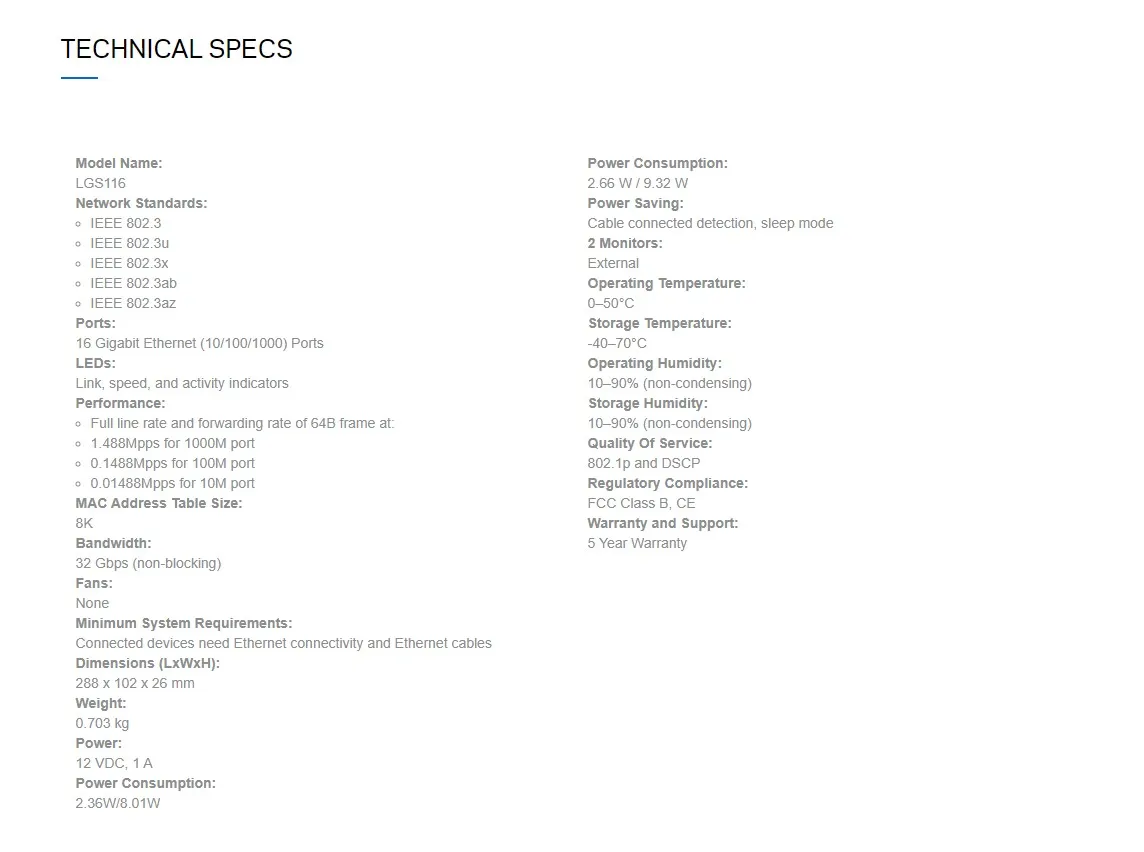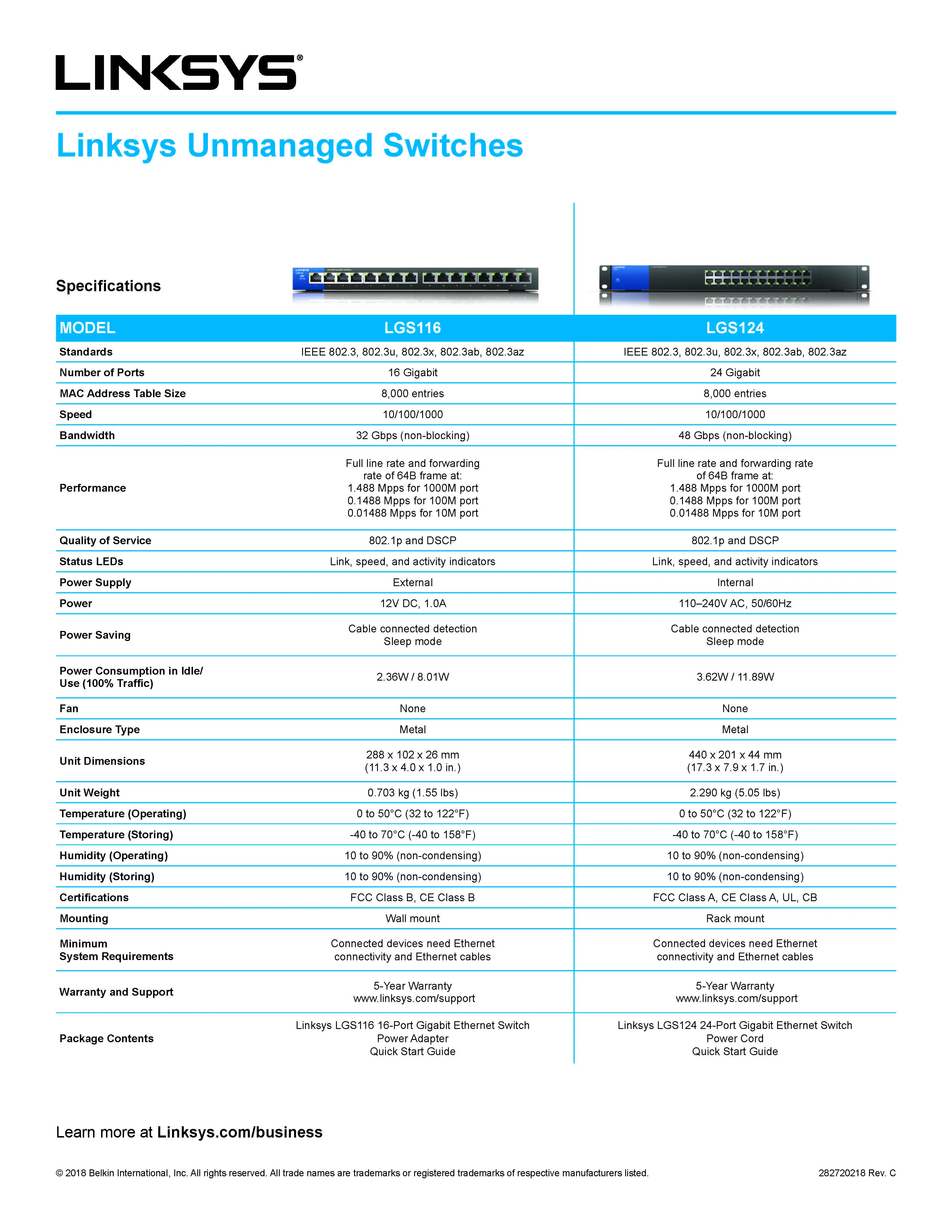 LINKSYS LGS116 16-Port Business Desktop Gigabit Switch Wired Connection Speed 1000 Mbps 16 Gigabit Ethernet Auto-Sensing