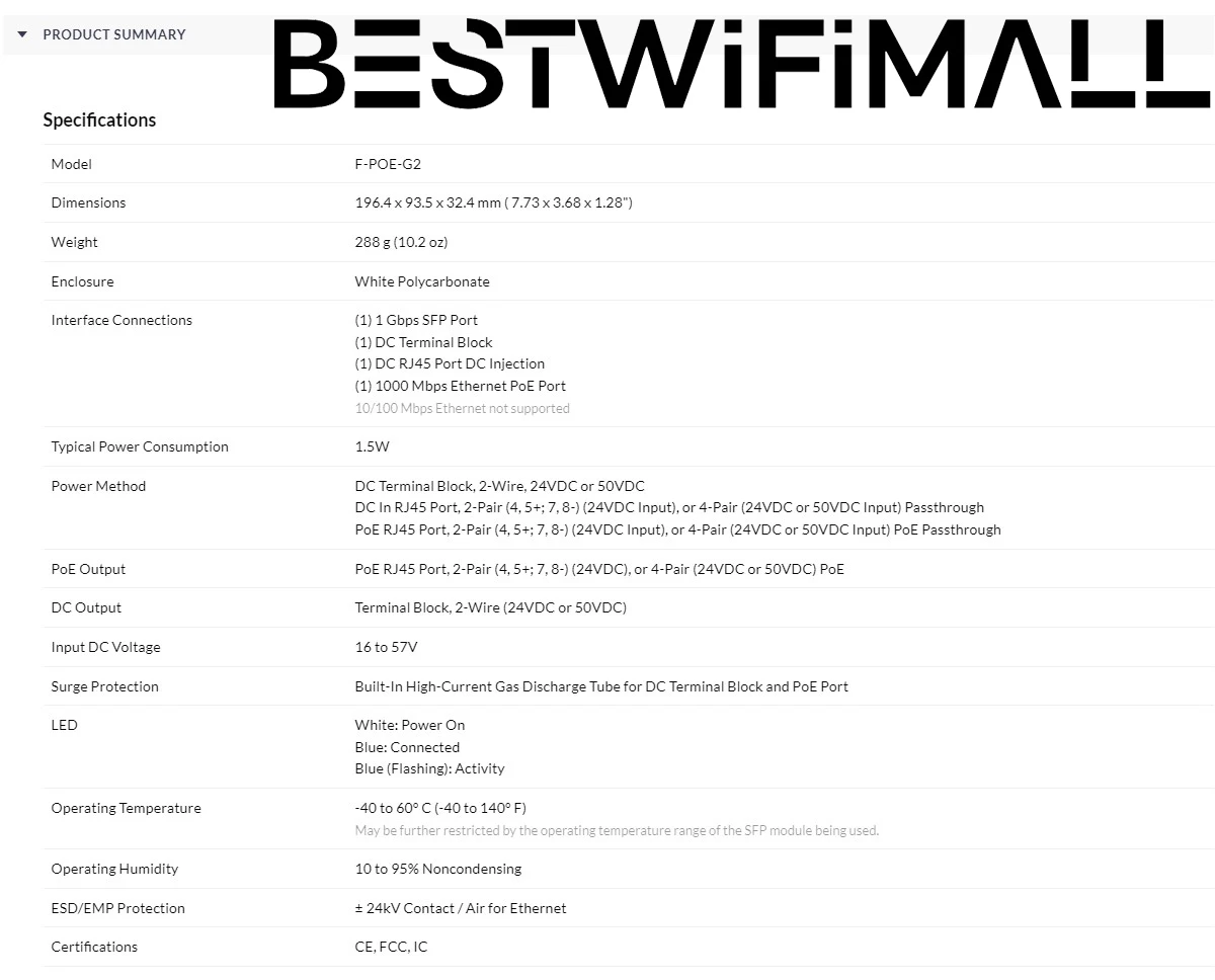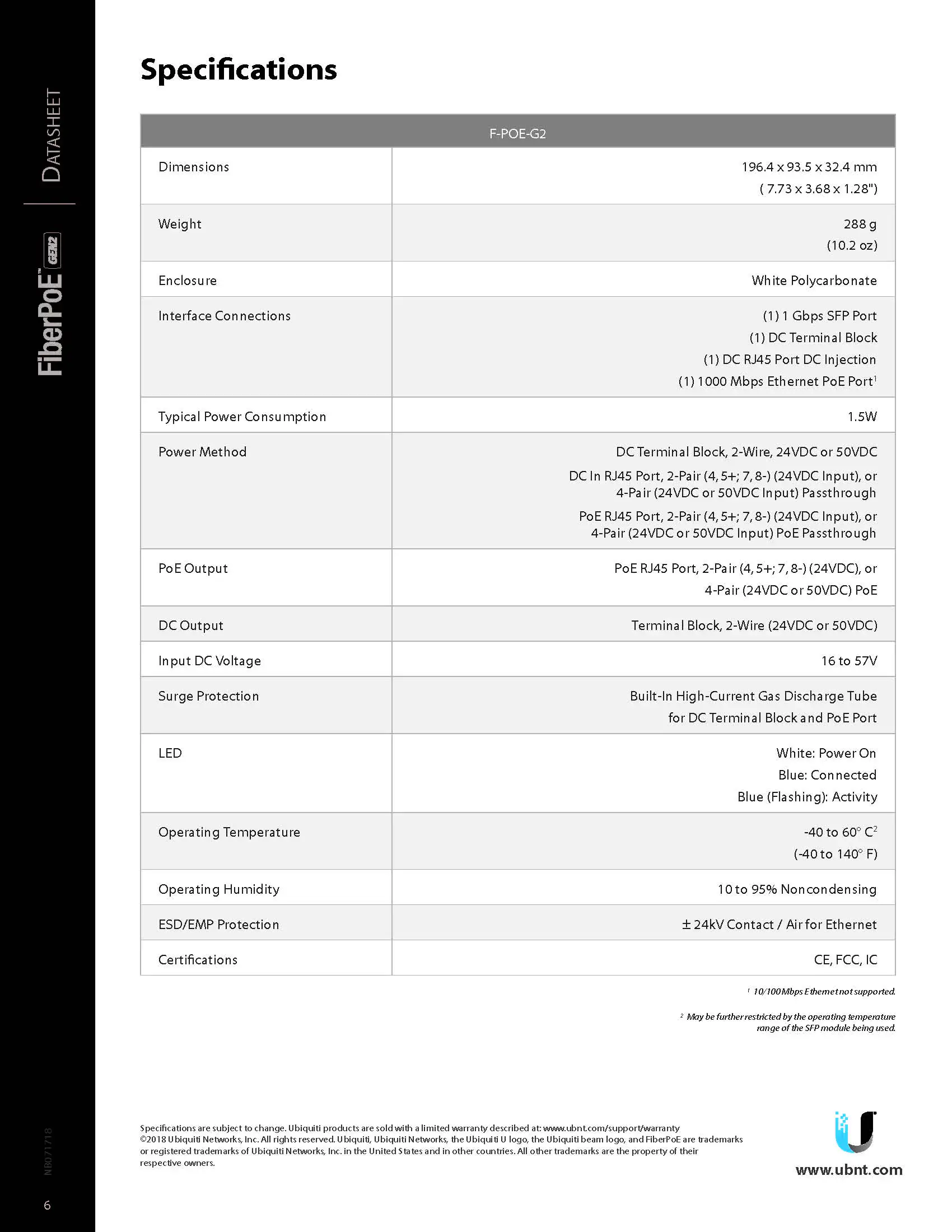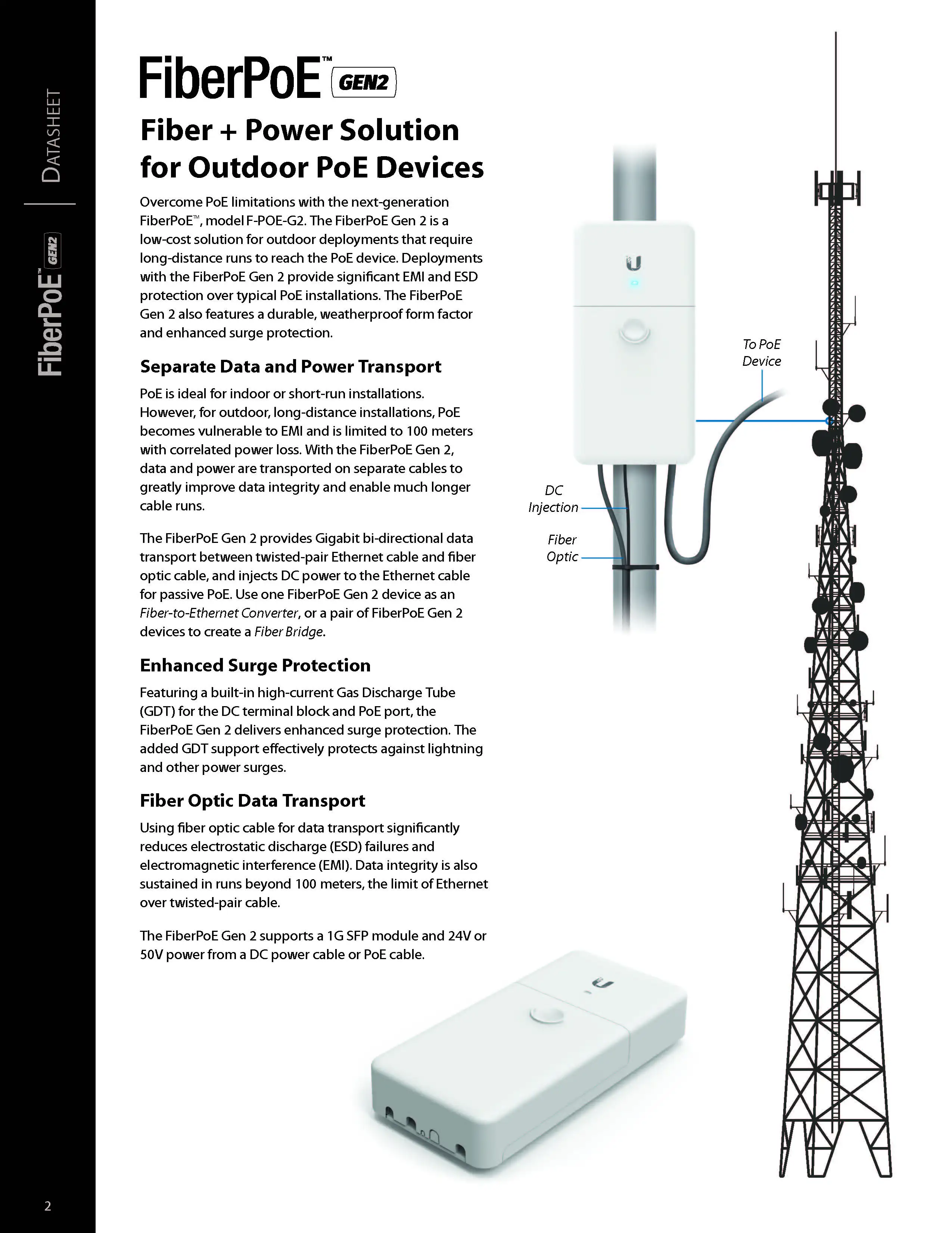 UBIQUITI F-POE-G2 Optical Data Transport, Connects Remote PoE Devices And Provides Data And Power Using Fiber And DC Cabling