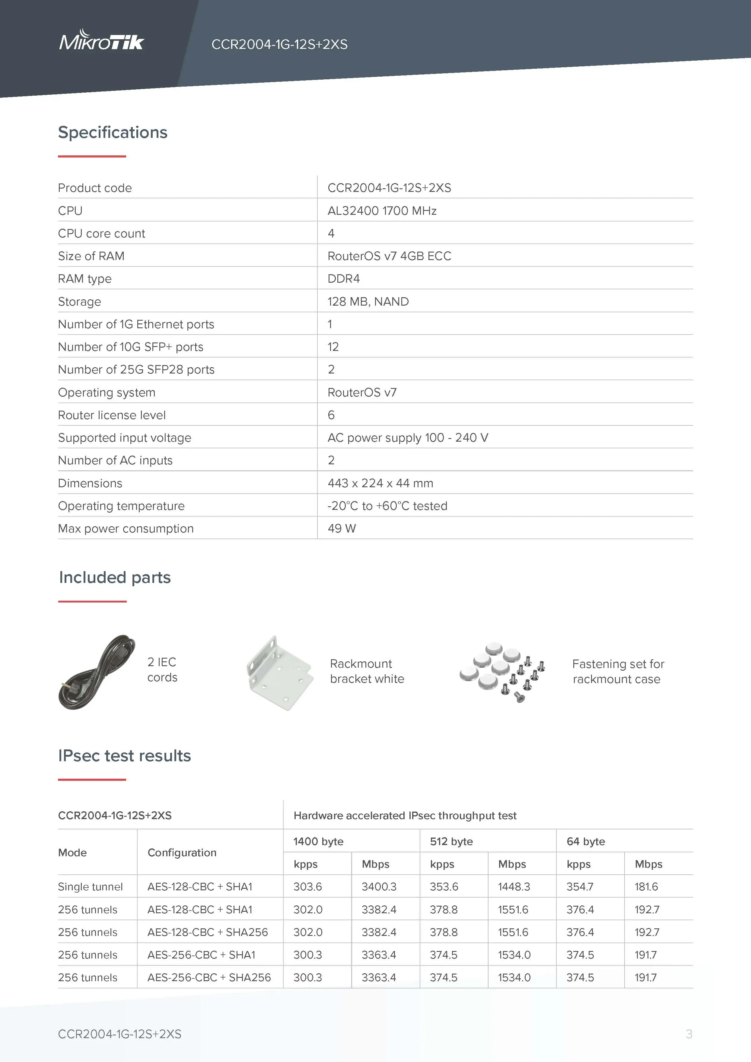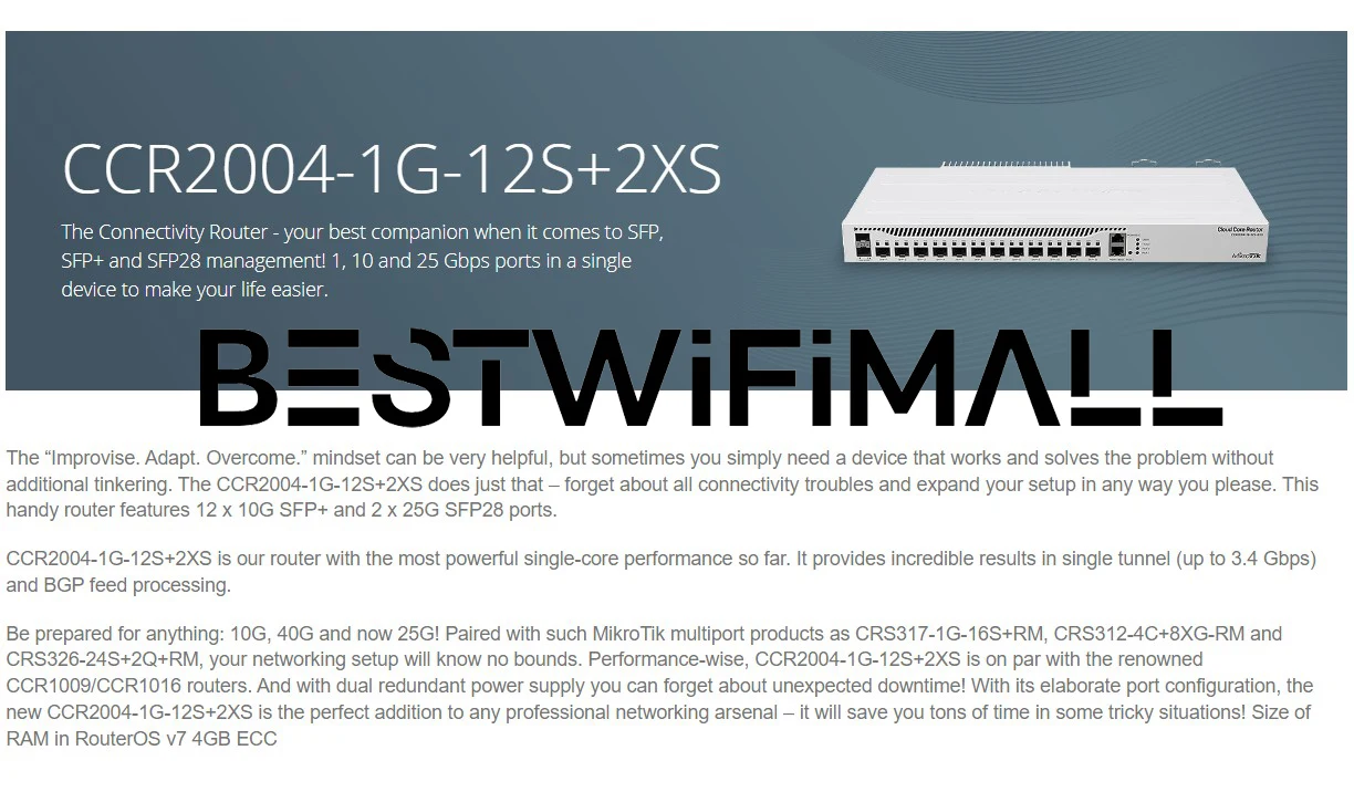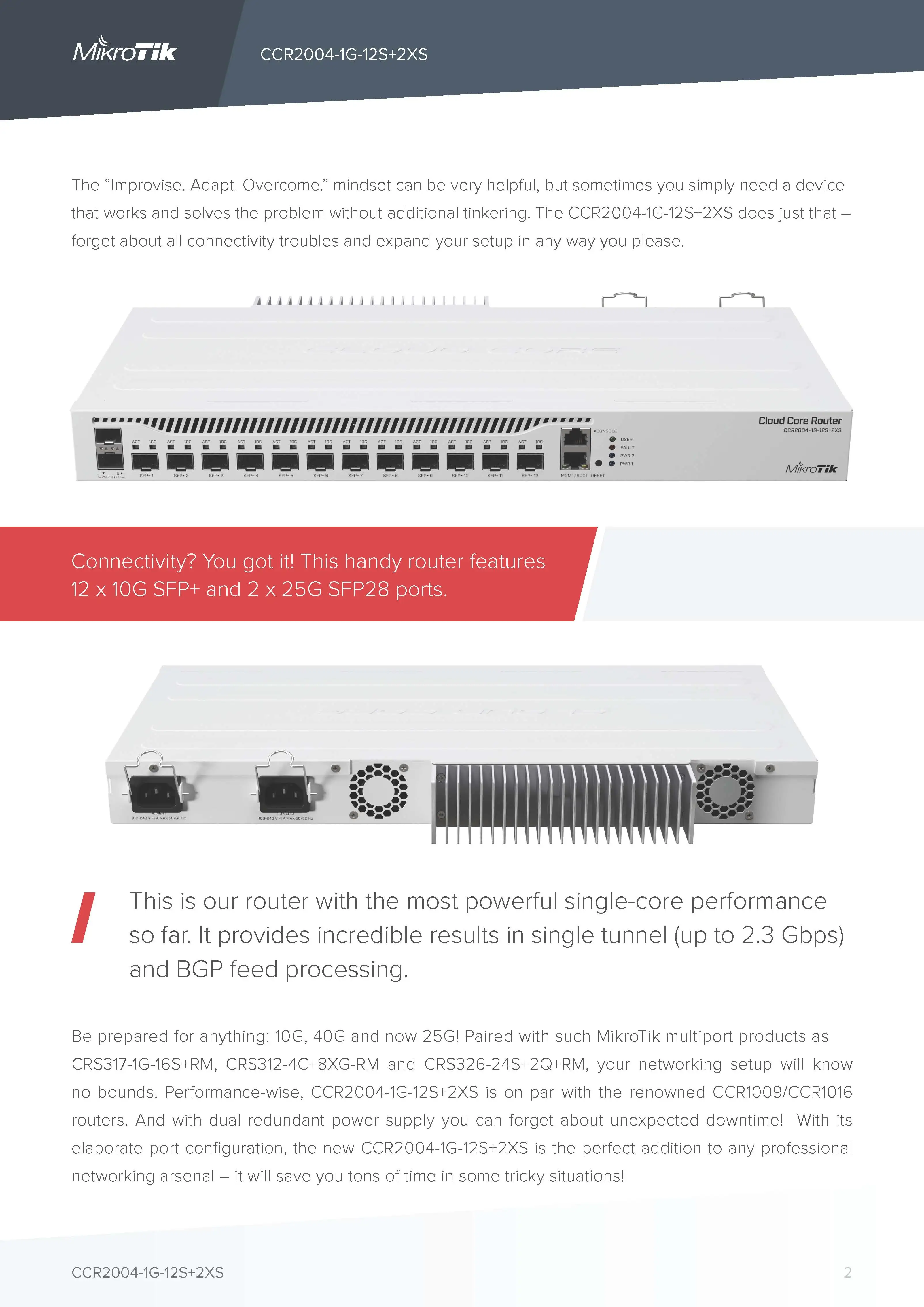 CCR2004-1G-12S+2XS is our router with the most powerful single-core performance so far. It provides incredible results in single tunnel (up to 3.4 Gbps) and BGP feed processing.