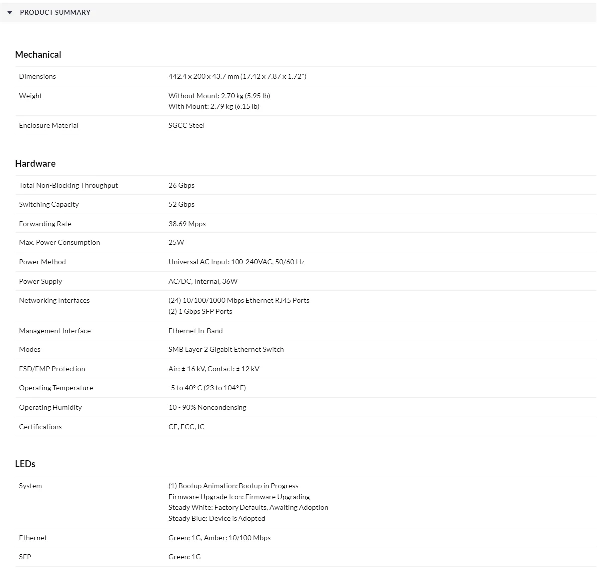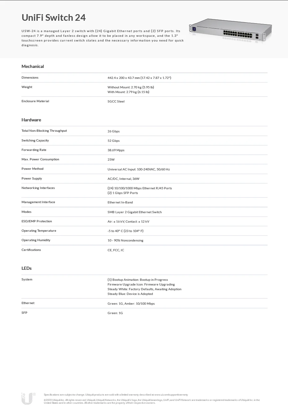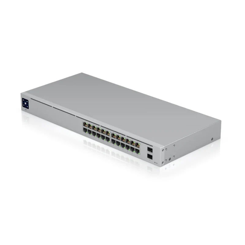 UBIQUITI USW-24 24-Port Layer 2 Switch (24 x GbE, 2x1G SFP ports, 52 Gbps Switching Capacity, a silent, fanless cooling system