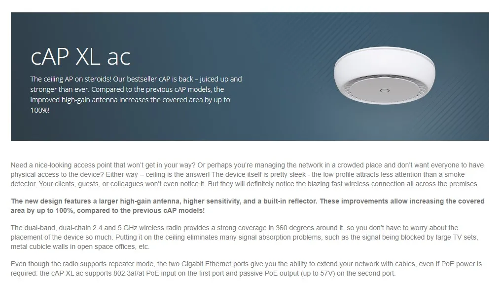 MikroTik RBcAPGi-5acD2nD-XL cAP XL AC Indoor Wireless Access Point Wifi 5 Ap 2.4GHz 5GHz 867Mbps, 802.11b/g/n/ac RouterOS