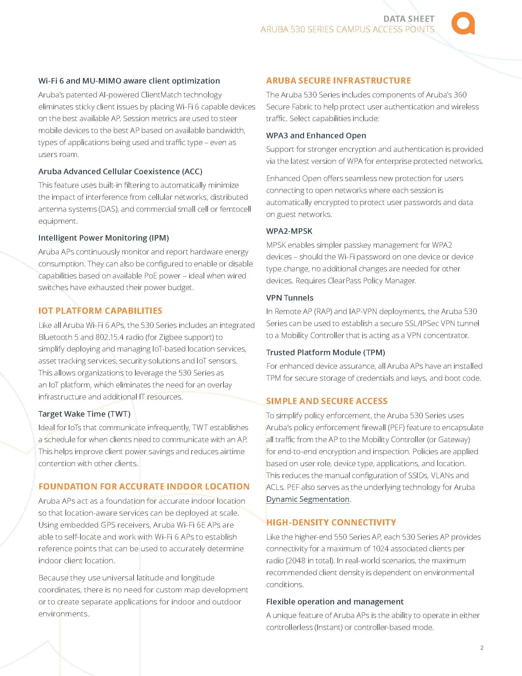 ARUBA Networks APIN0535 AP-535 / IAP-535(RW) Indoor Access Point Wi-Fi 6 802.11ax OFDMA U-MIMO 2.97 Gbps, 1024 Clients Per Radio