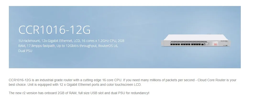 Mikrotik CCR1016-12G Router 12xGigabit Ports, LCD, 16 Cores 1.2GHz CPU, 2GB RAM,12Gbps Throughput, RouterOS L6, 1U Rackmount