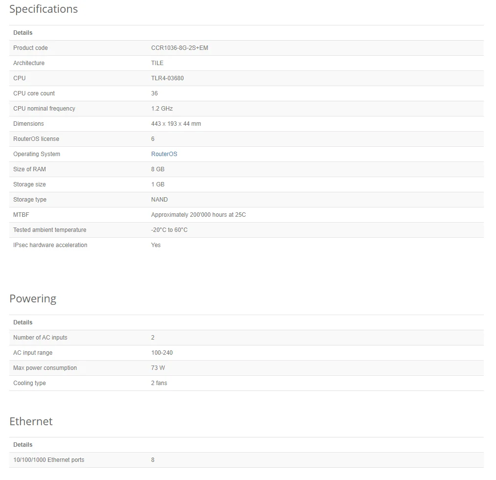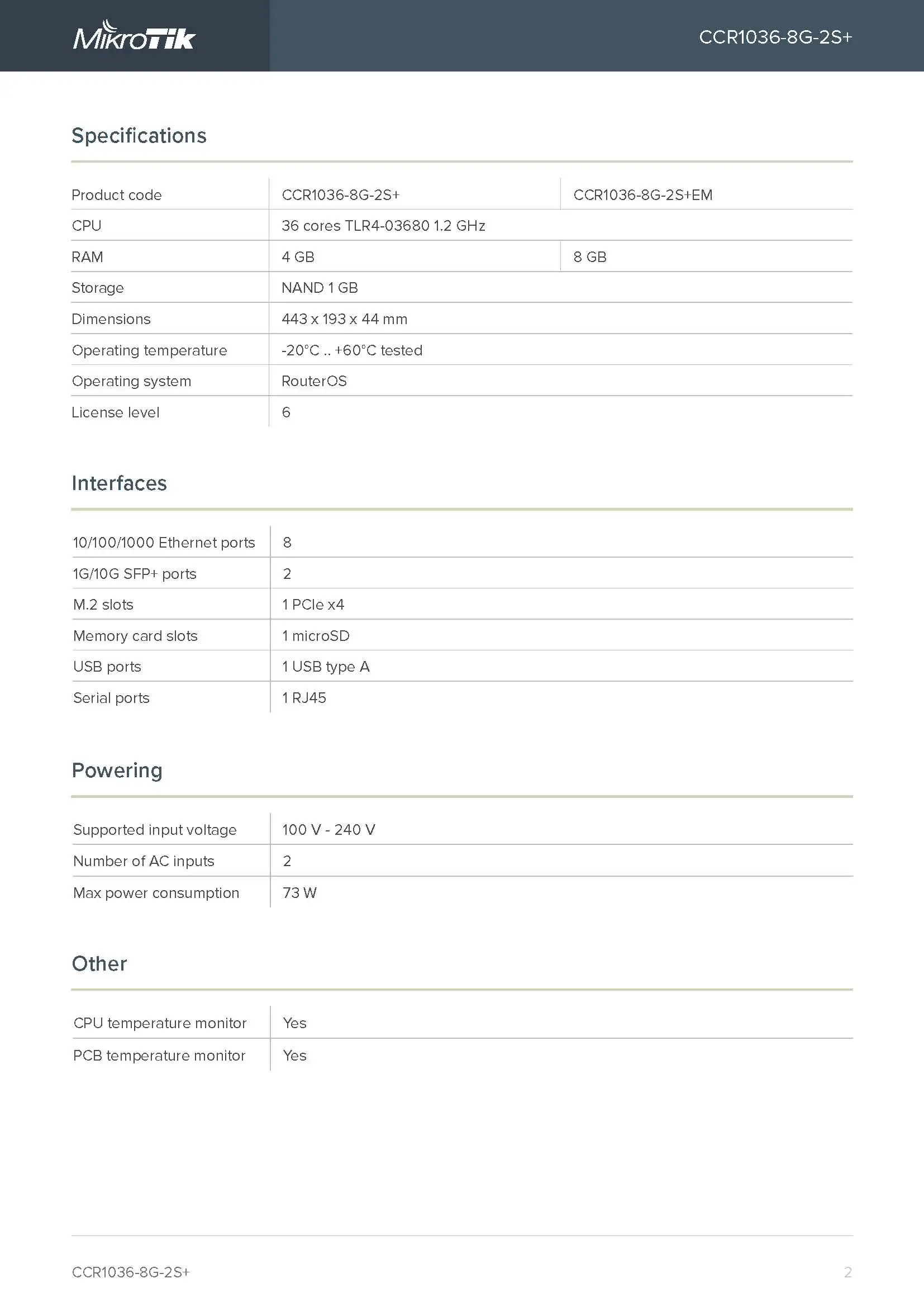 MikroTik CCR1036-8G-2S+EM Router 8xGigabit Ethernet, 2xSFP+ Cages, LCD, 36 Cores x 1.2GHz CPU, 8GB RAM, Dual PSU, 1U Rackmount