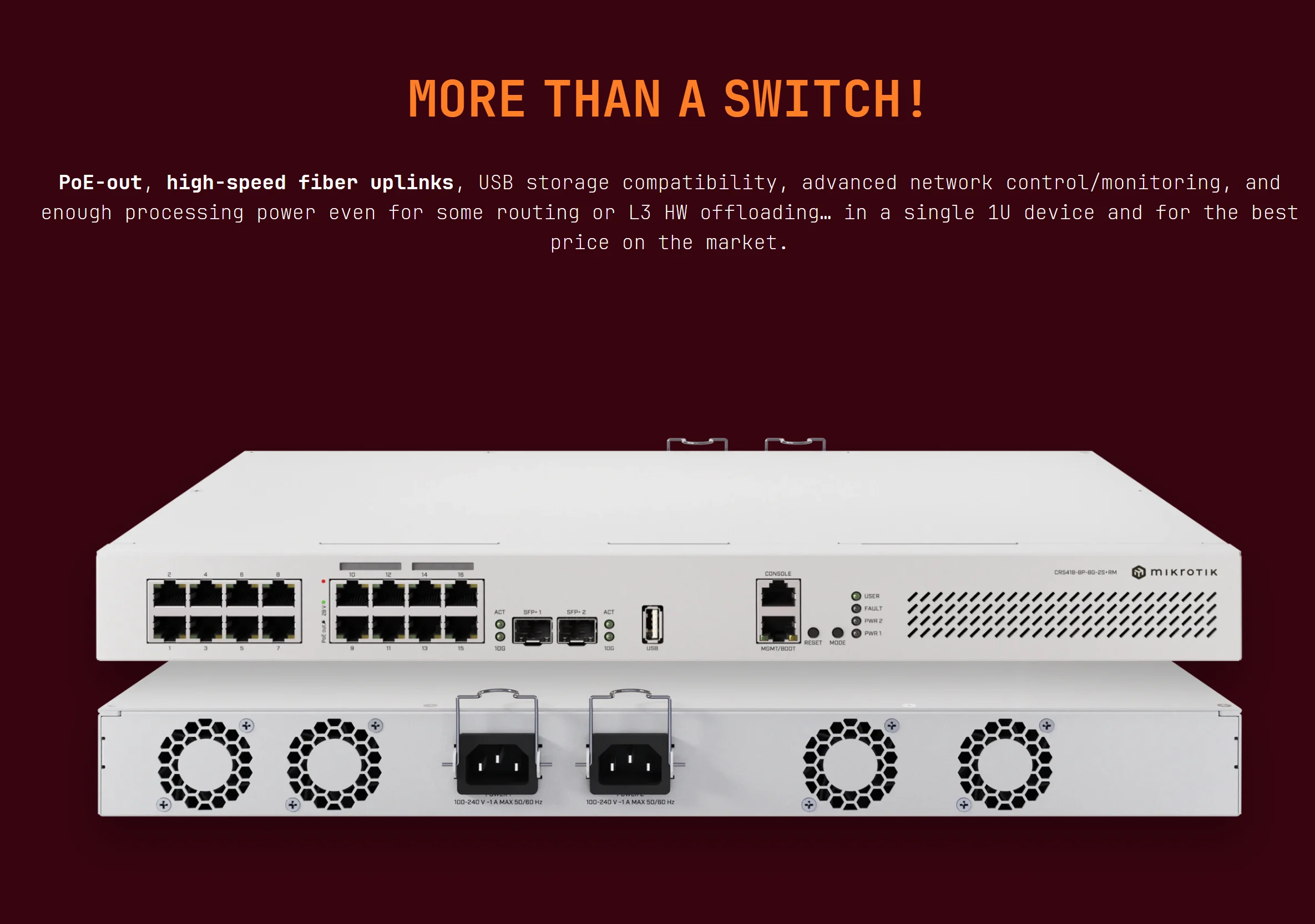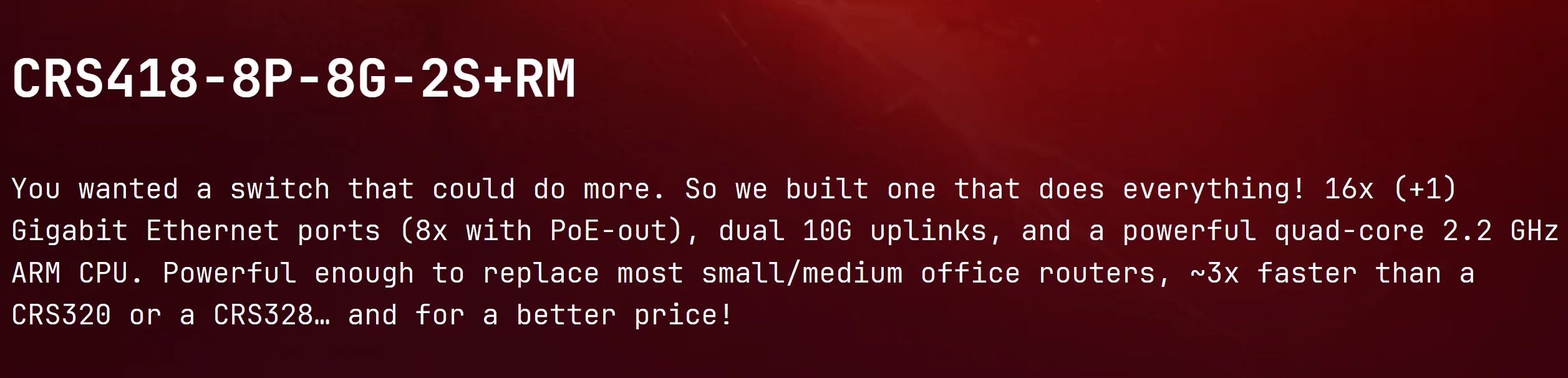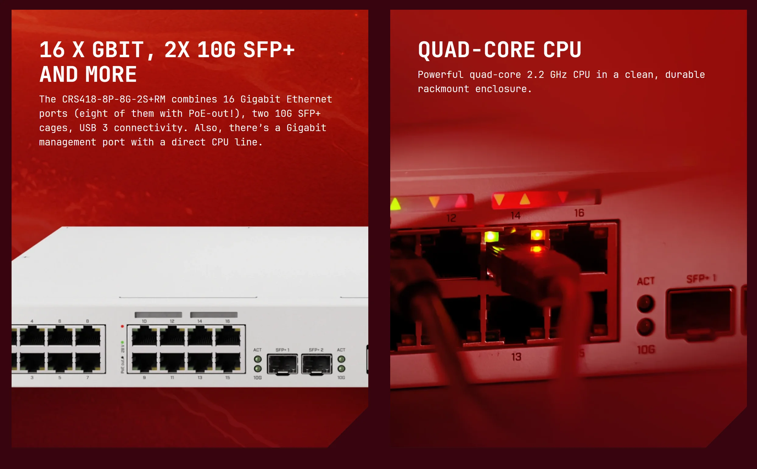 MikroTik CRS418-8P-8G-2S+RM Switch 16x (+1) Gigabit Ethernet Ports (8x with PoE-Out) Dual 10G Uplinks Quad-Core 2.2 GHz ARM CPU