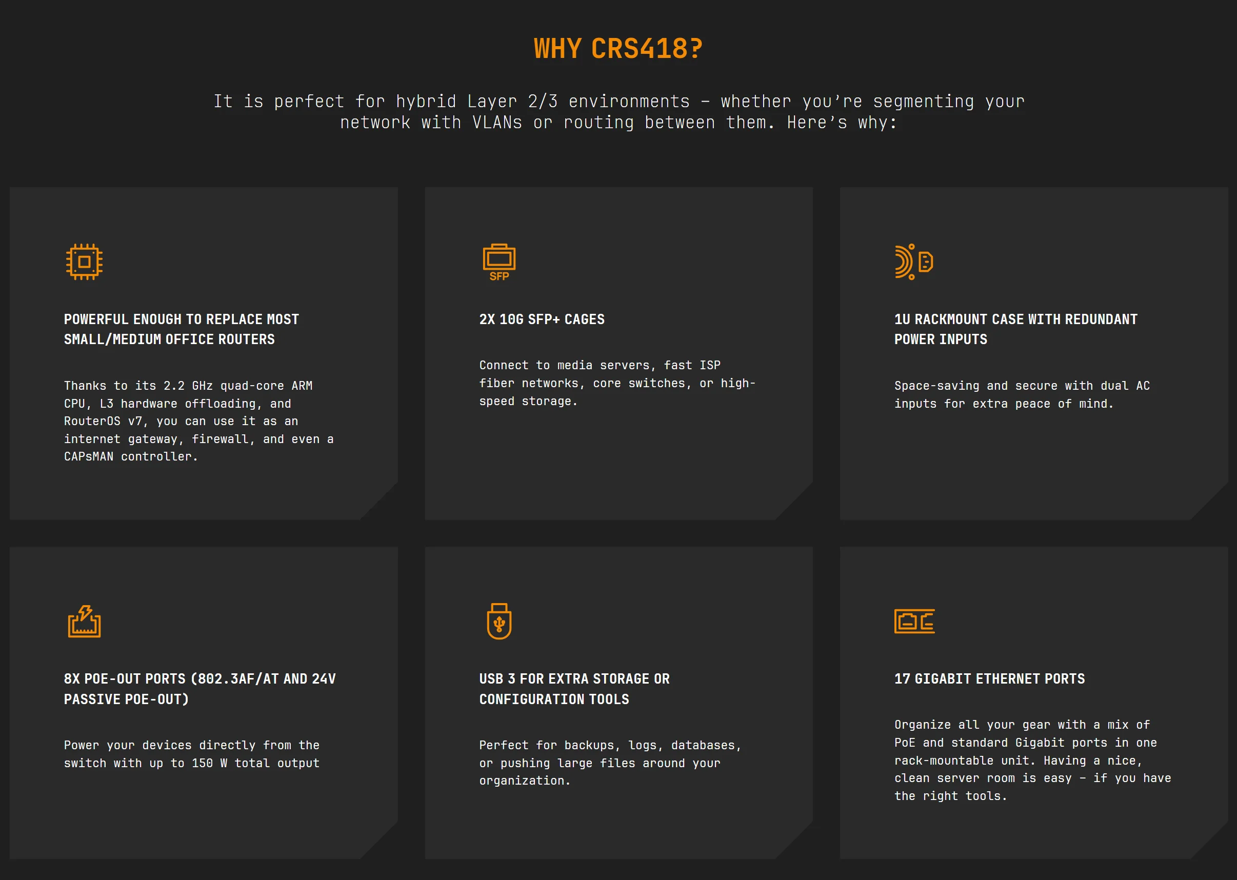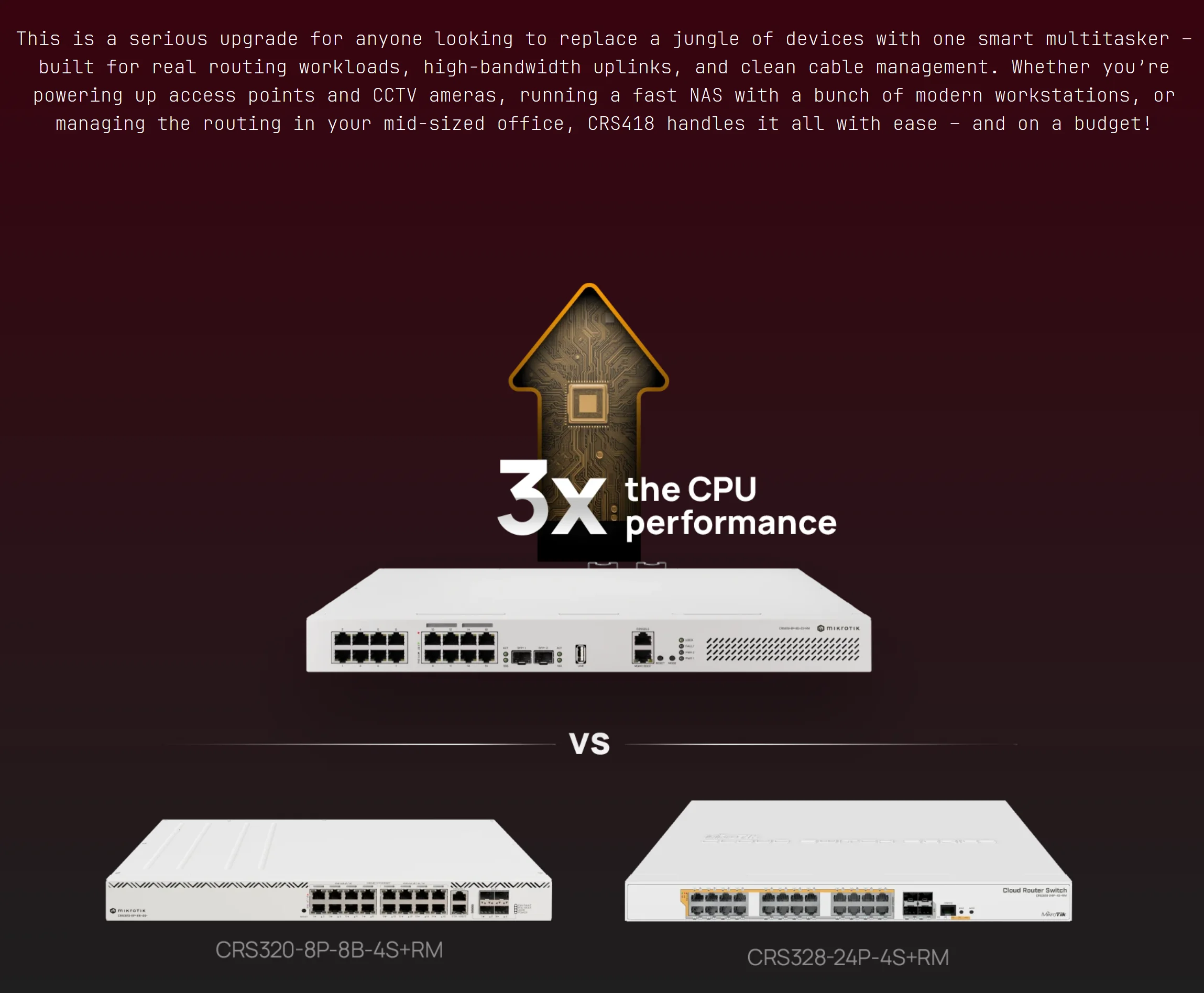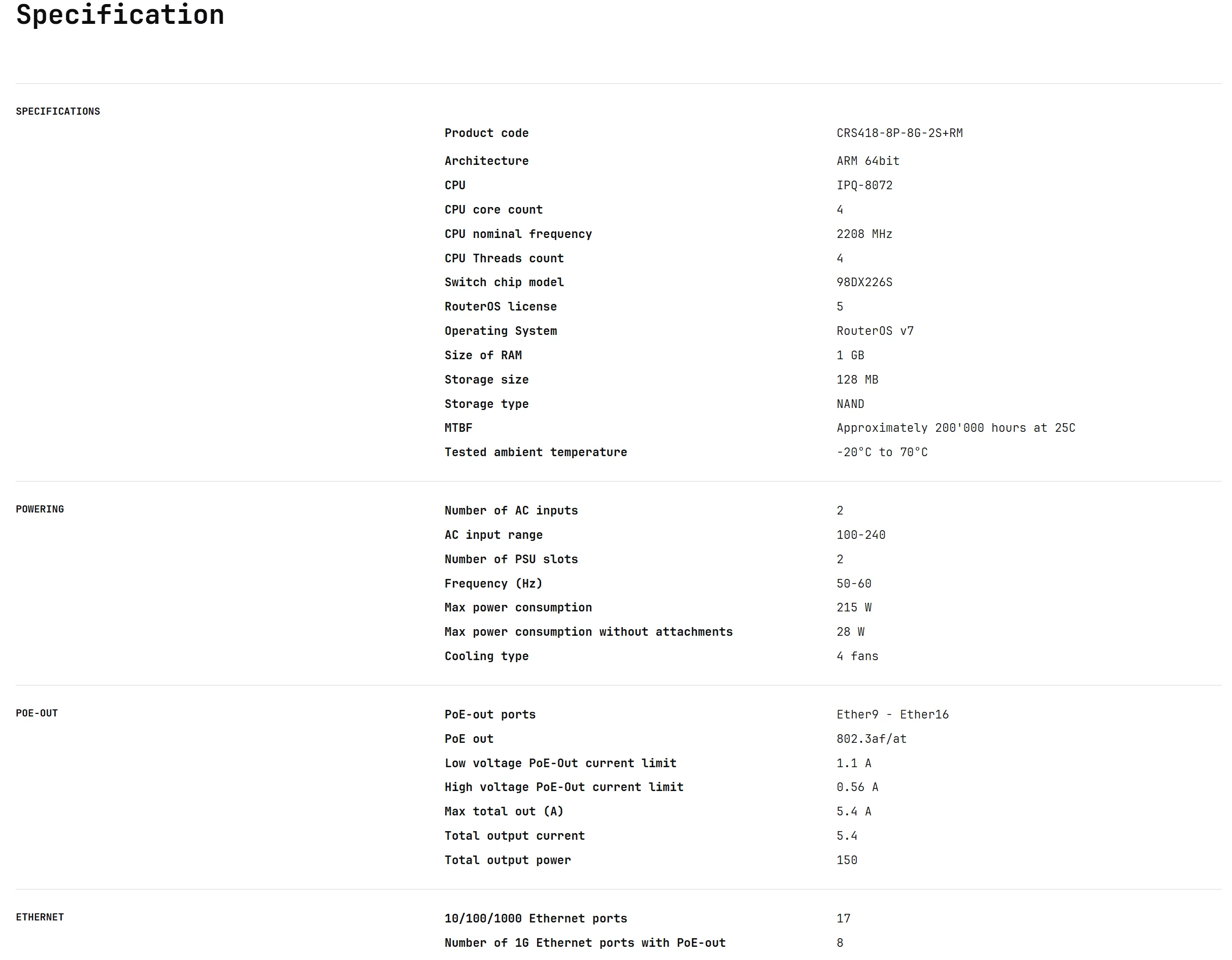 MikroTik CRS418-8P-8G-2S+RM Switch 16x (+1) Gigabit Ethernet Ports (8x with PoE-Out) Dual 10G Uplinks Quad-Core 2.2 GHz ARM CPU
