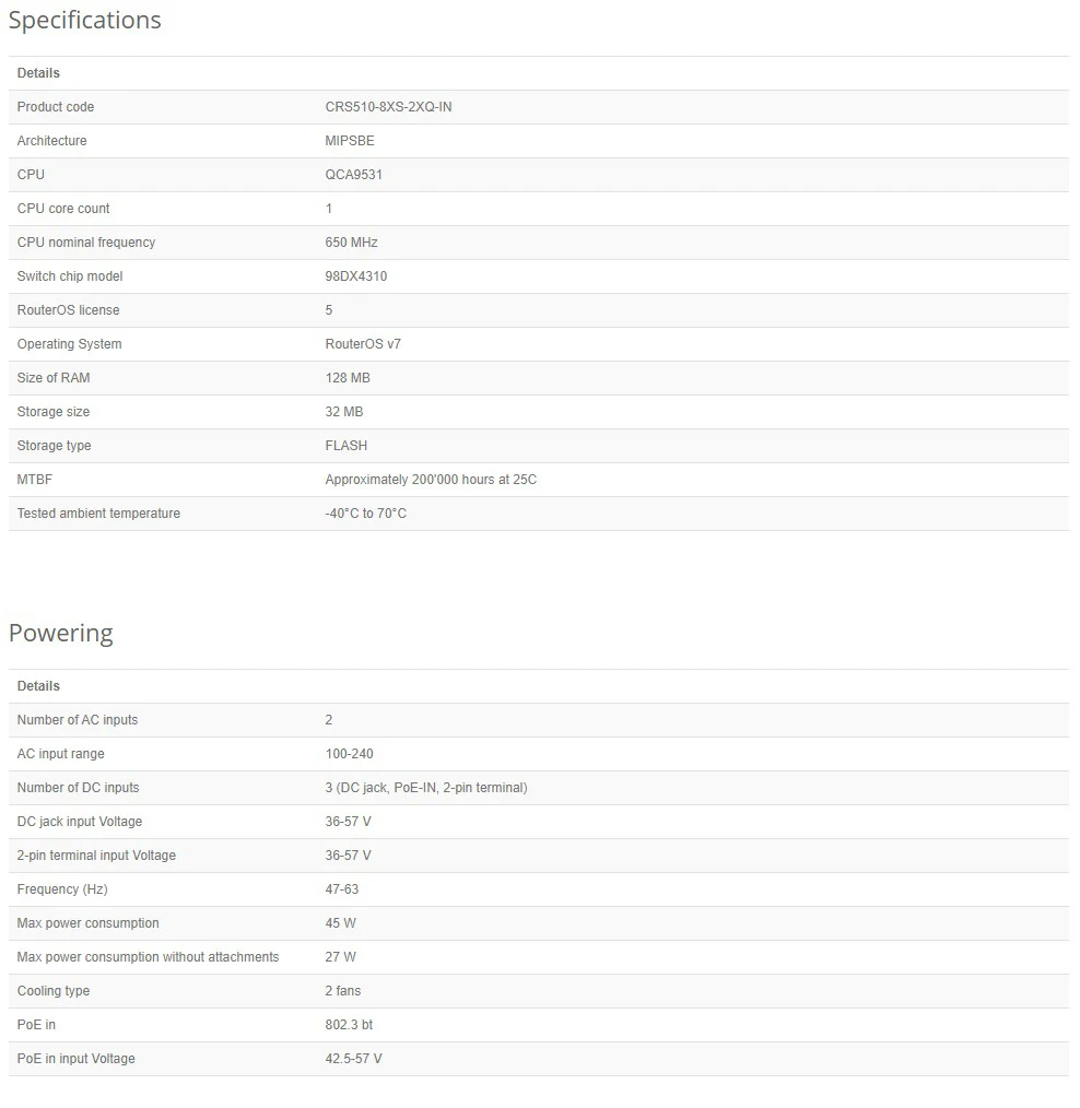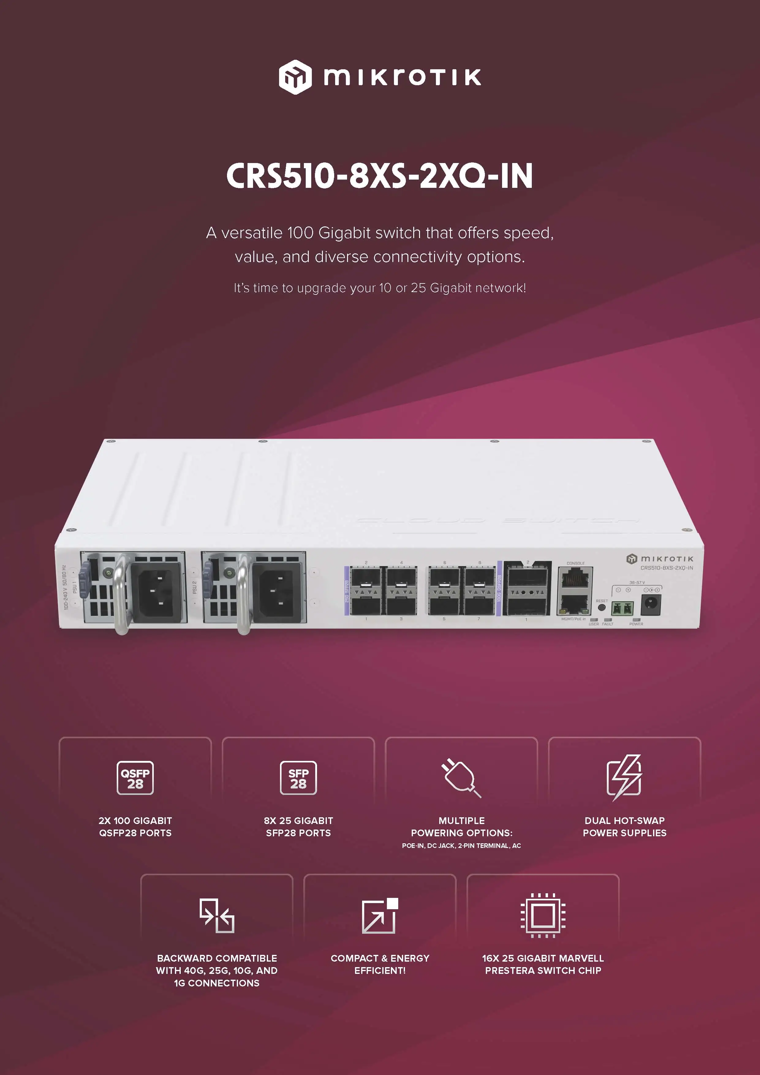 MikroTik CRS510-8XS-2XQ-IN L3 Switch 2x100Gigabit QSFP28 Ports, 8x25Gigabit SFP28 Ports, Dual Hot-Swap Power Supplies, VLANs ACL