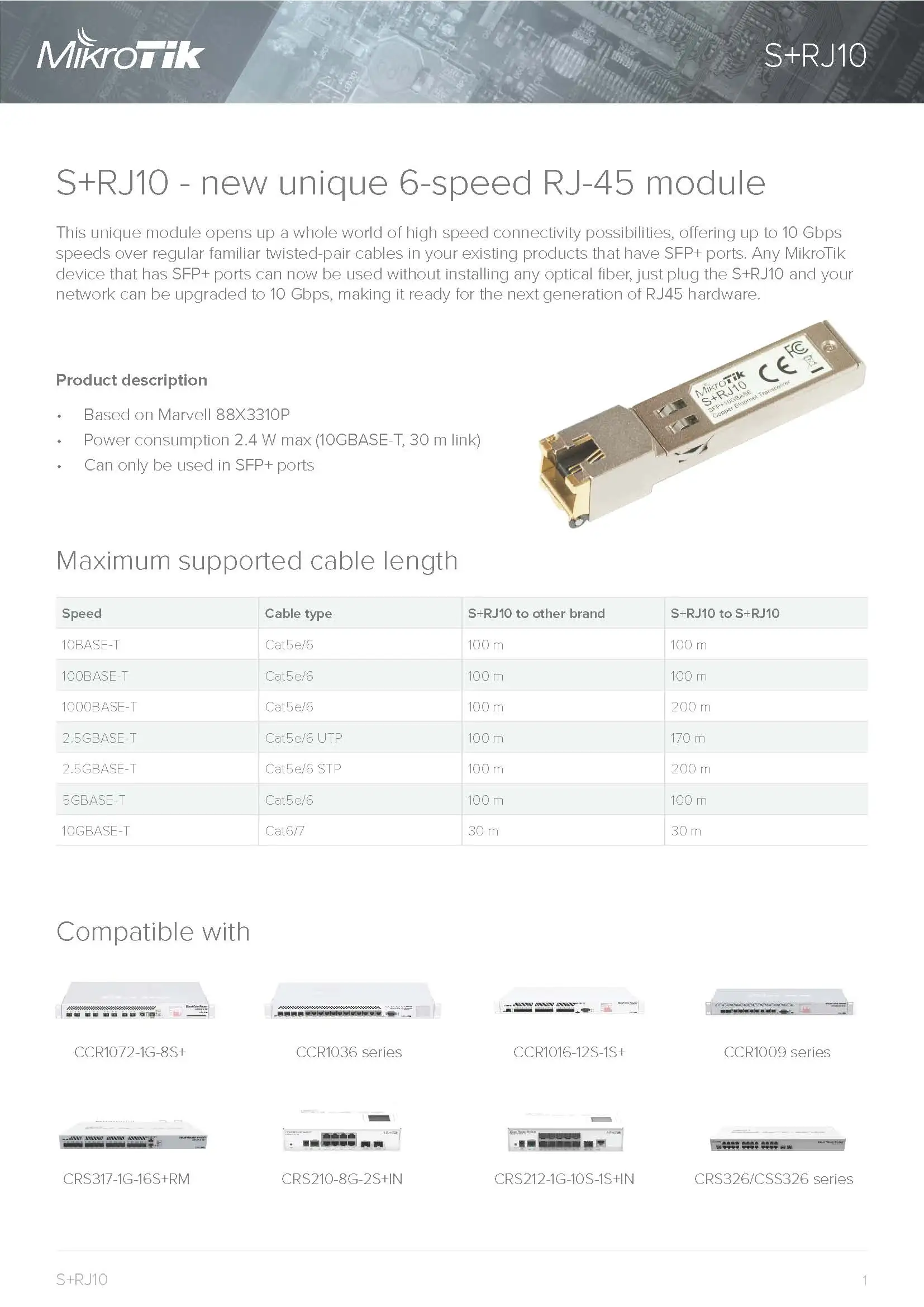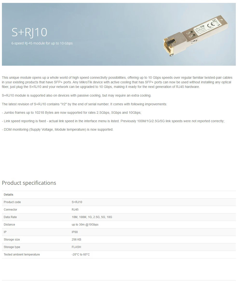 MikroTik S+RJ10 SFP+ 6-Speed RJ-45 Module For Up To 10 Gbps, Only 1 PCS