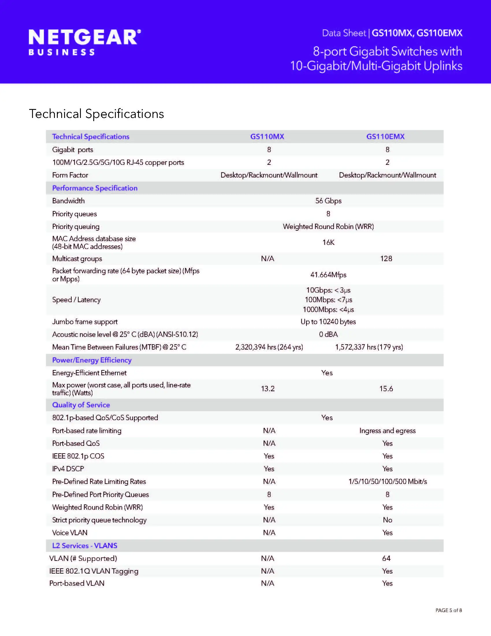 GS110EMX 8-Port Gigabit Ethernet Plus Switch with 2 auto-adapt 5-speed networking ports (100M, 1G, 2.5G, 5G, 10G) support. Through an intuitive GUI it provides easy, reliable and affordable connectivity with VLAN, QoS, LAG and IGMP management capabilities.