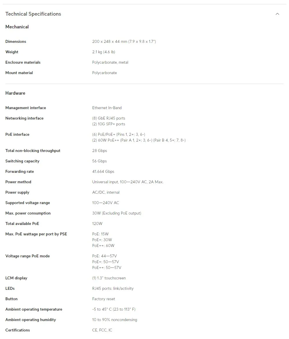 UBIQUITI USW-Pro-8-POE 120W 8 Port PoE Layer 3 Switch Pro 8xGbE PoE+, 6xGbE PoE+ 2xPoE++Ports 2x10G SFP+Ports 56Gbps Capacity