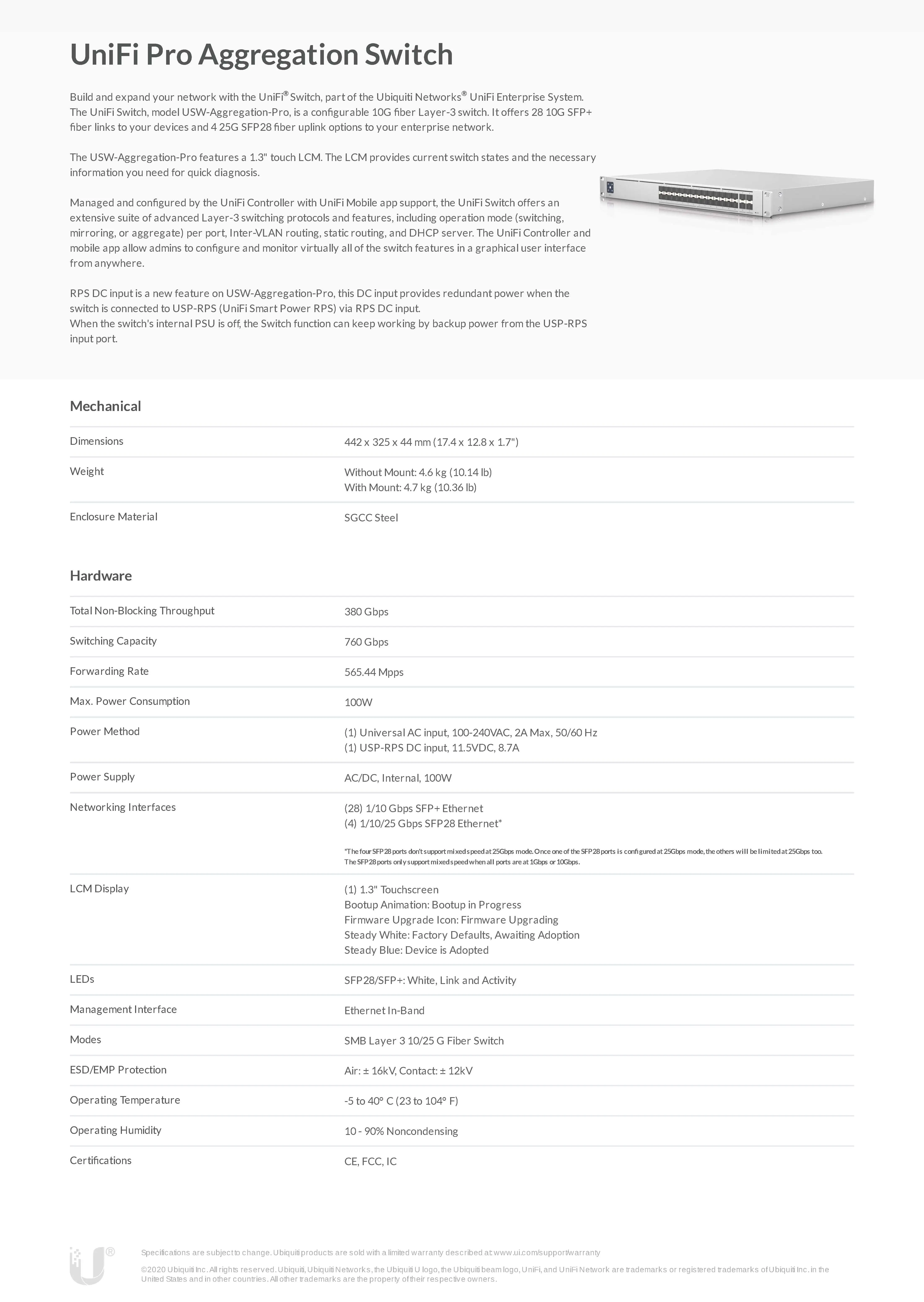 UBIQUITI USW-Pro-Aggregation Switch Pro Aggregation 28x10G SFP+, 4x 25G SFP28 Ports, 760Gbps Switching capacity Layer 3 switch
