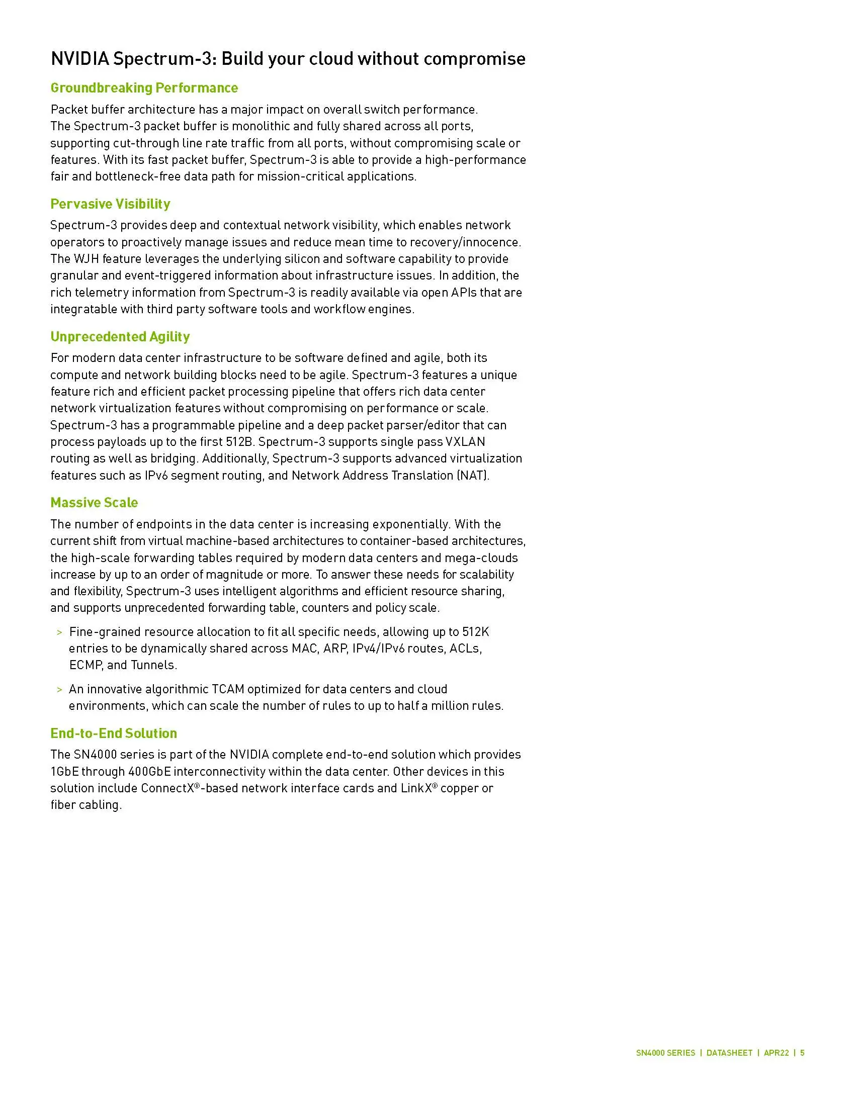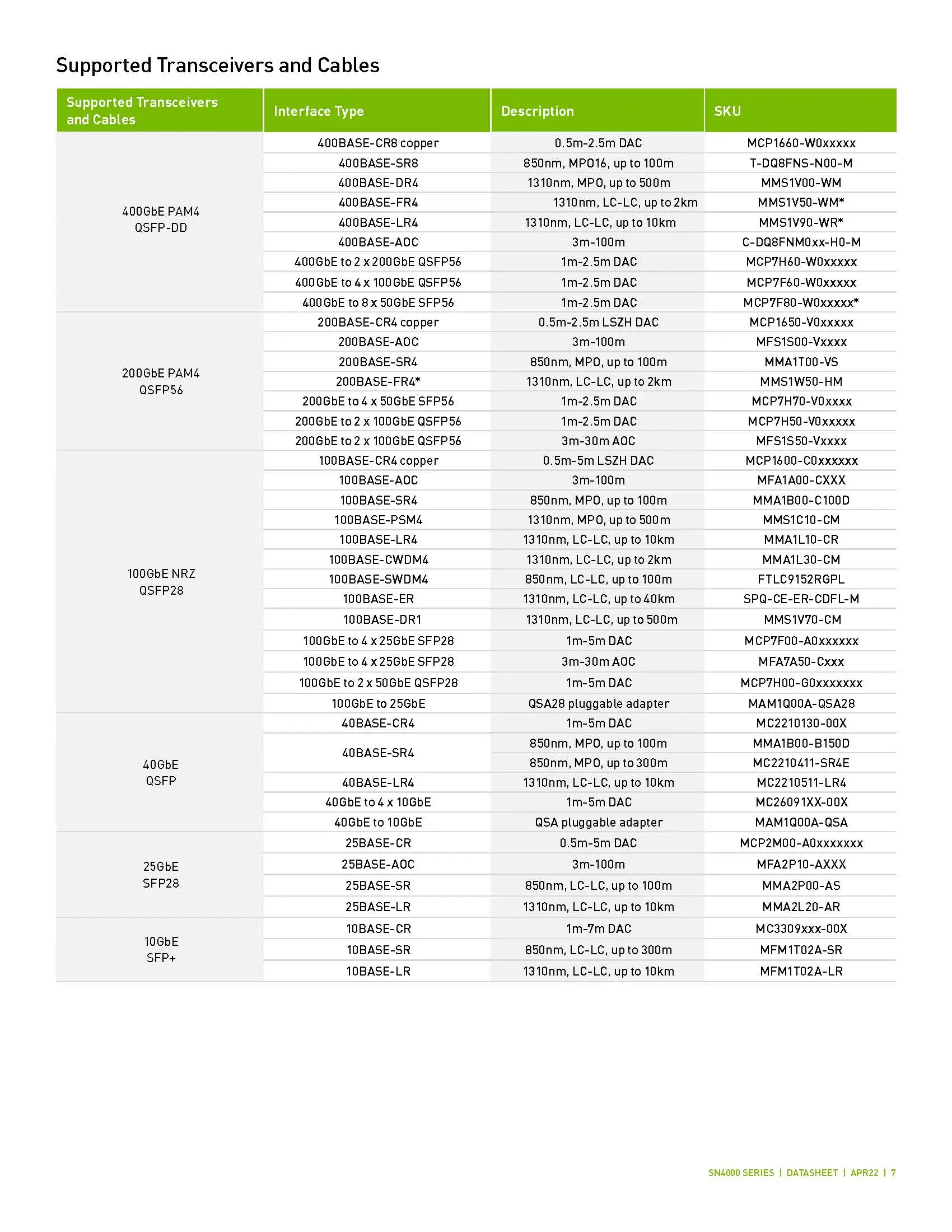 The SN4700 spine/super-spine offers 32 ports of 400GbE in a compact 1U form factor. It enables connectivity to endpoints at varying speeds and carries a throughput of 25.6Tb/s, with a landmark 8.4Bpps processing capacity. As an ideal spine solution, the SN4700 allows maximum flexibility, with port speeds spanning from 1GbE to 400GbE per port.