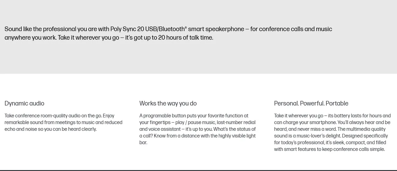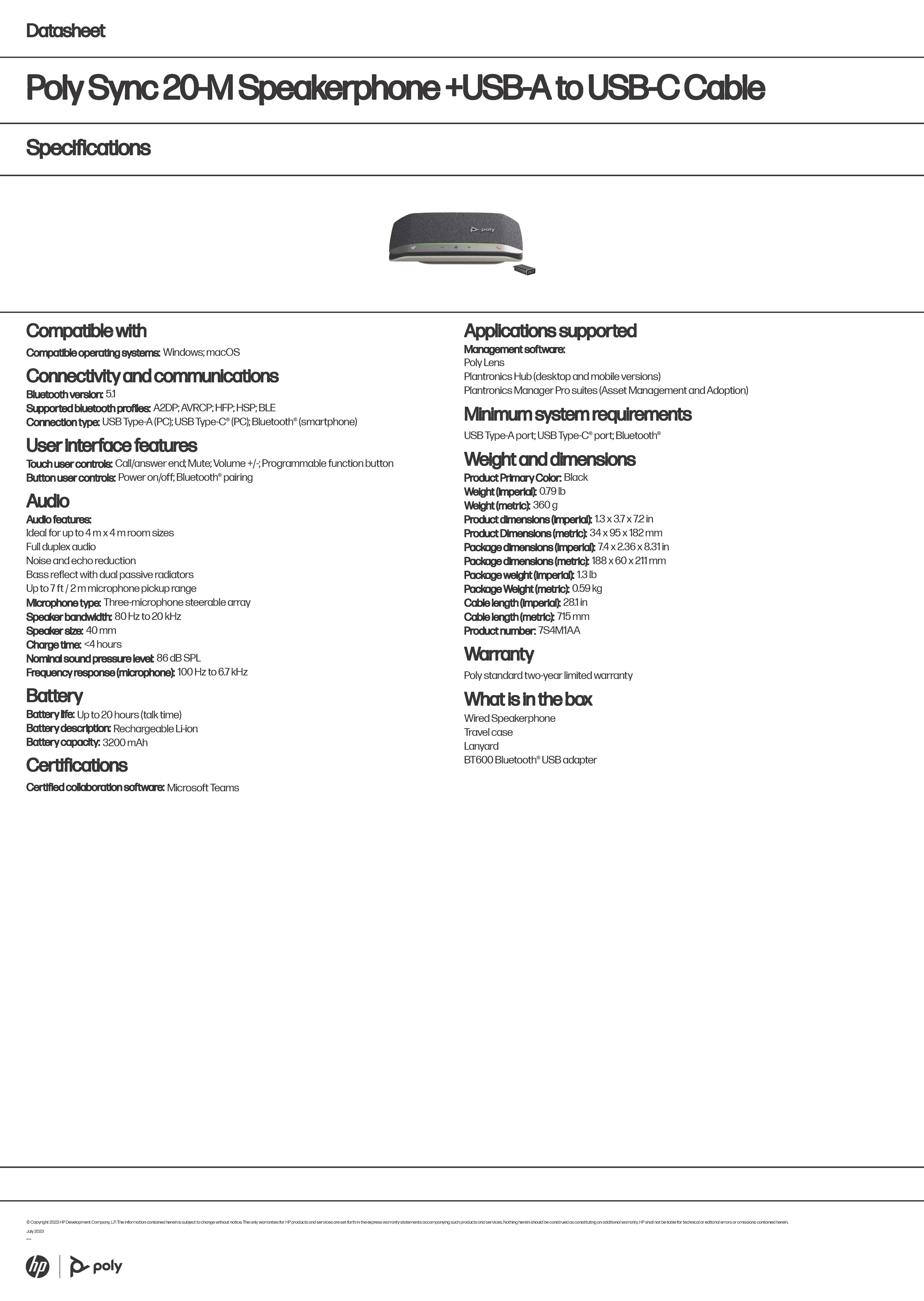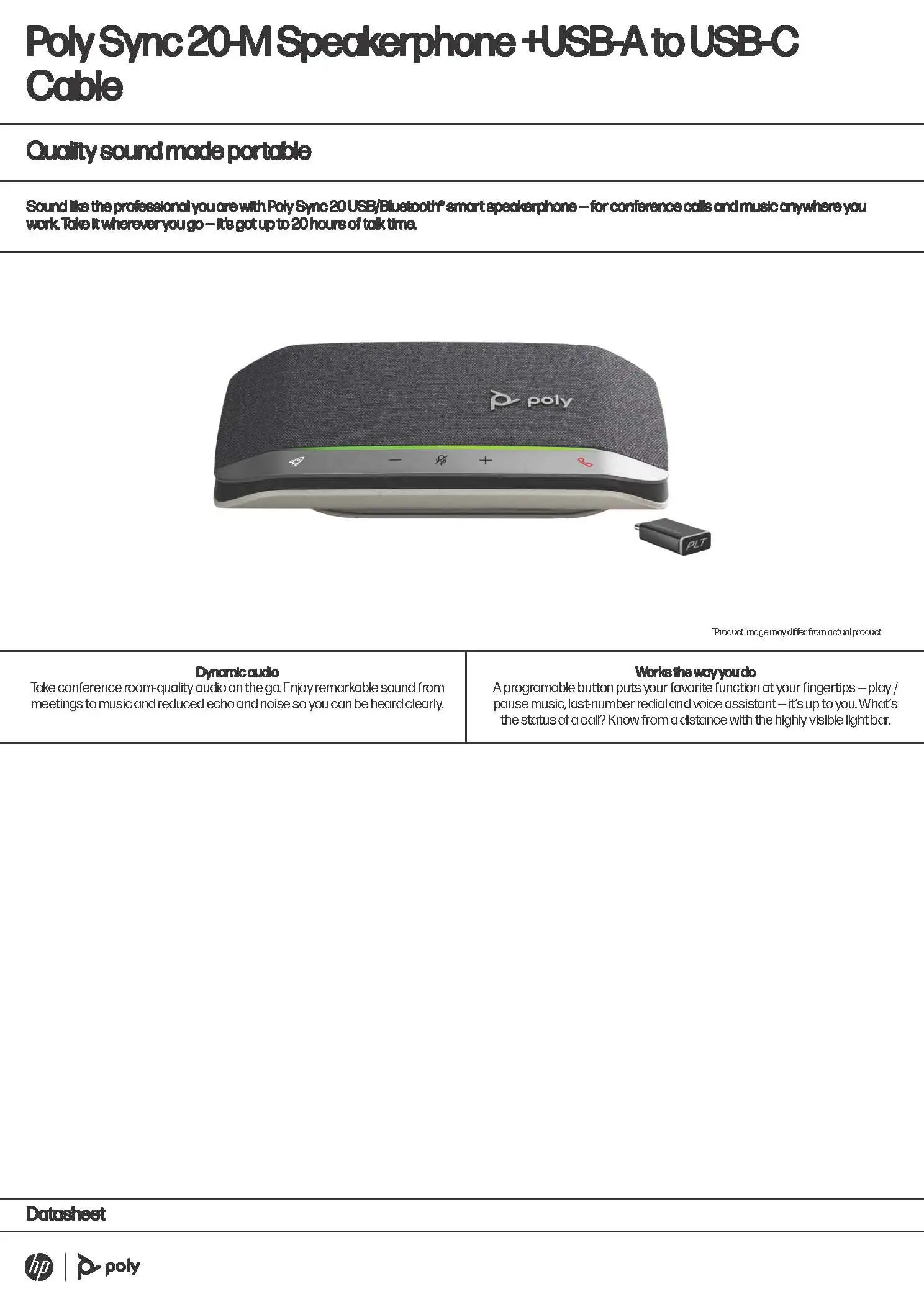 Poly Sync 20-M Speakerphone +USB-A to USB-C Cable USB/Bluetooth Smart Speakerphone, Up To 20 Hours Of Talk Time, Dynamic Audio