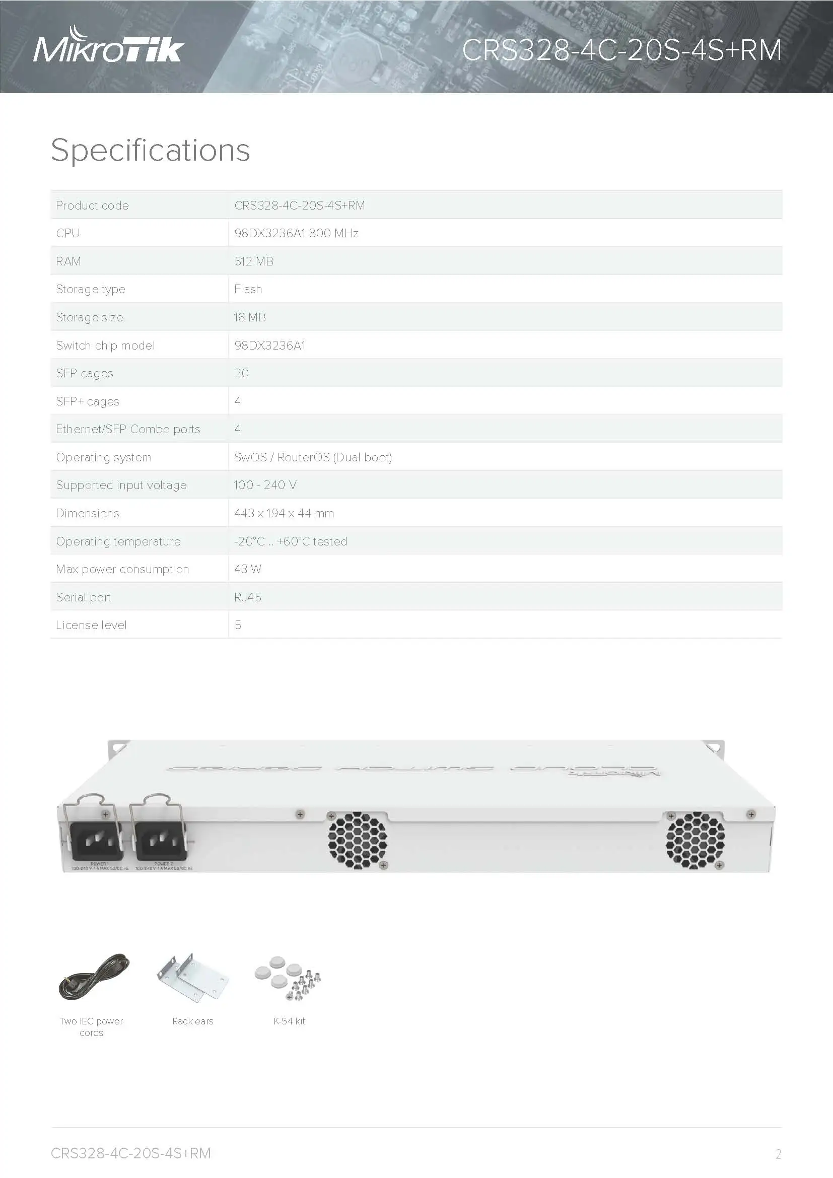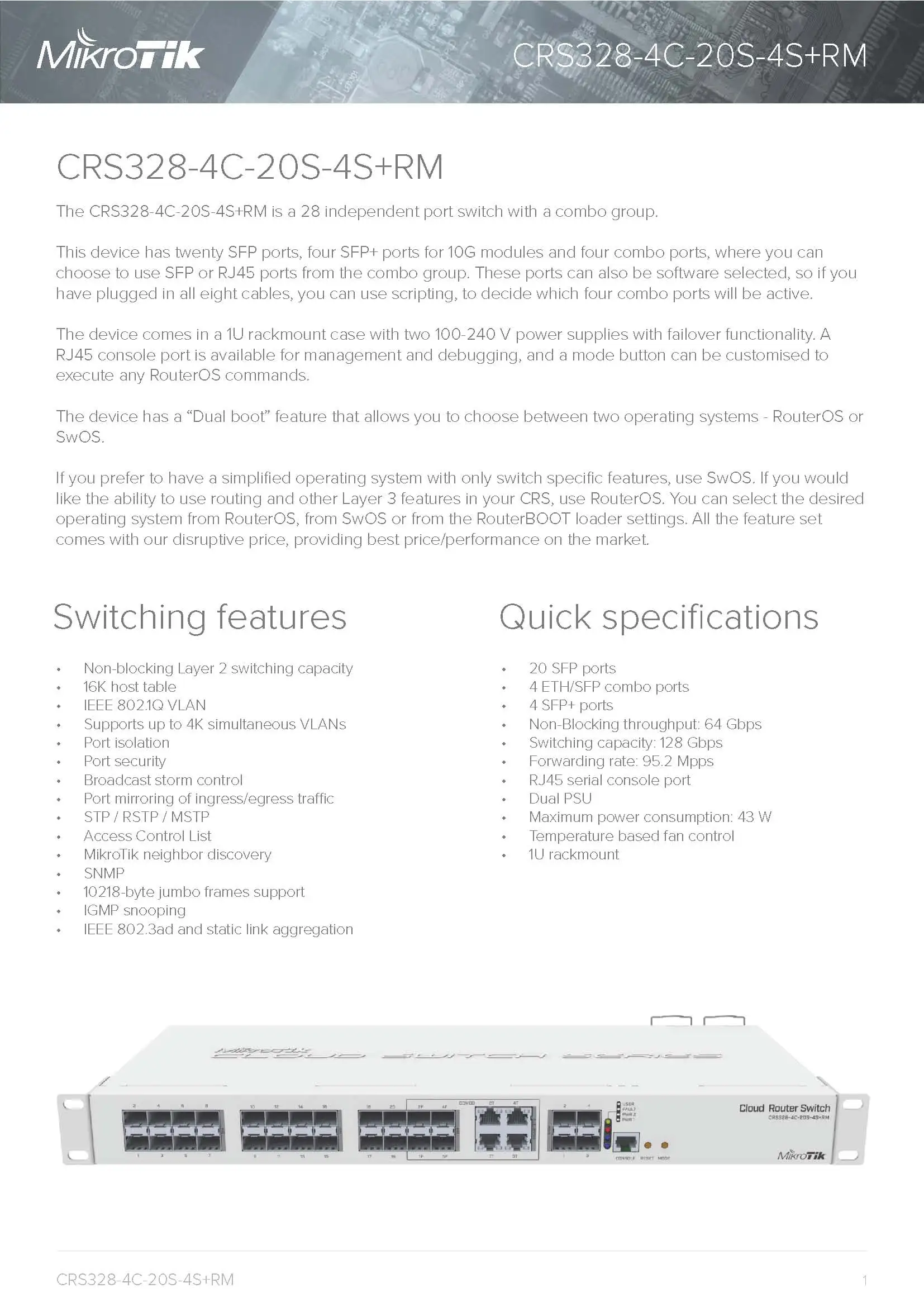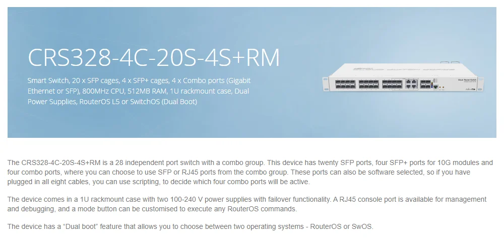 MikroTik CRS328-4C-20S-4S+RM Smart Switch 20 ячеек SFP, 4xSFP+, 4xкомбинированных порта (Gigabit Ethernet или SFP), процессор 800 МГц, 512 МБ ОЗУ