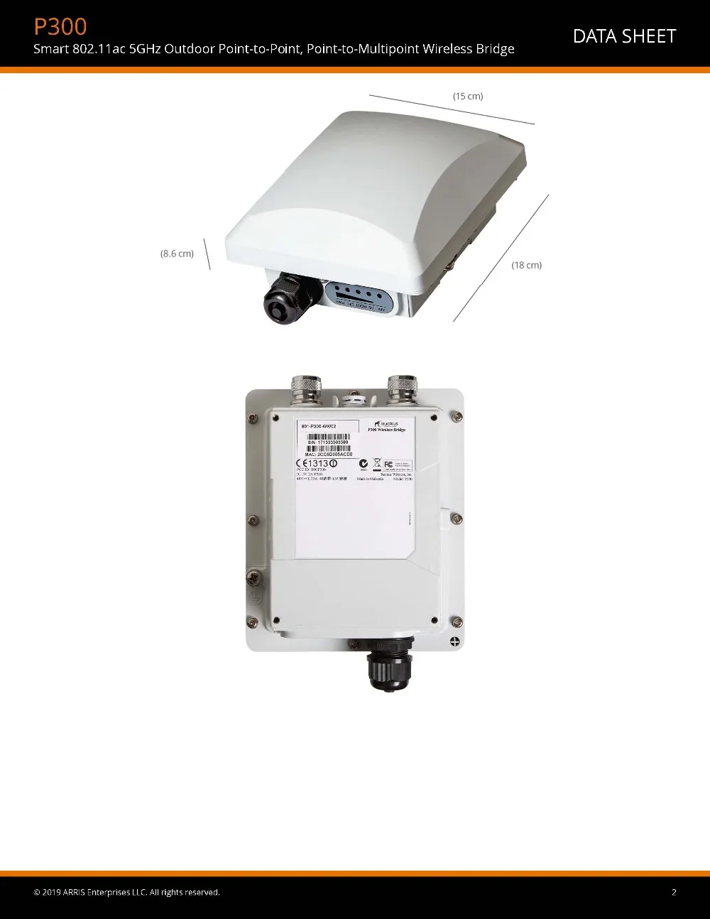 802.11ac Point-to-Point or Point-to-Multipoint Bridge5GHz operation20MHz, 40MHz, and/or 80MHz channelization14dBi internal directional antenna2 external N-Type antenna connectors802.3af Power over EthernetRuggedized for outdoor conditions: -40°C to 65°C operating temperature, IP67Maximum link distance 12 km (using internal antenna)Dedicated radar avoidance pre scan (DFS)PD-MRC for reliable bridge connectionsSimple installation with mounting brackets includedAutomatic pairing and easy aiming between bridgesOptional accessories available to enhance range & performance