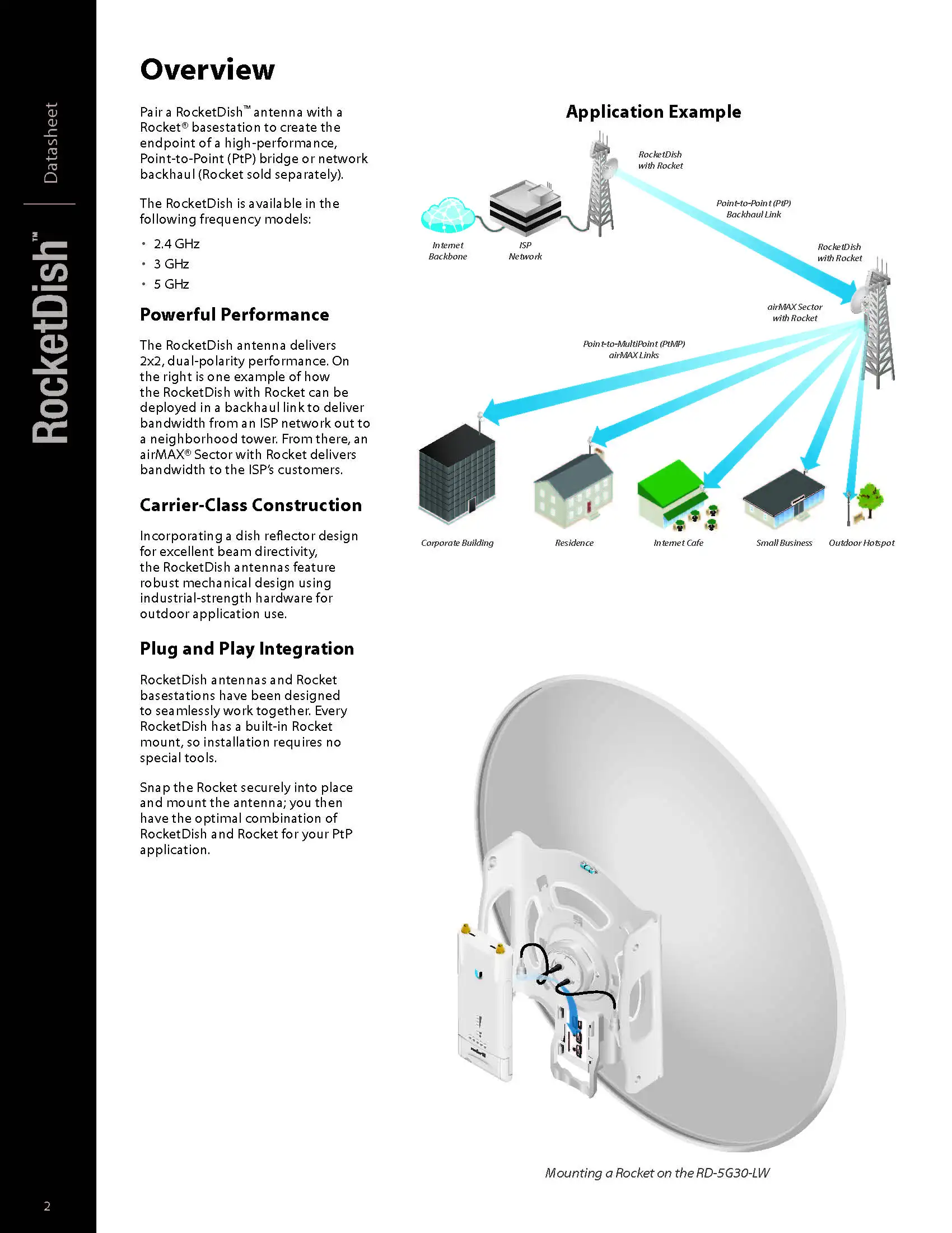 airMAX® 2x2 PtP Bridge Dish Antenna Pair the RocketDish™ with a Rocket™M BaseStation for Point‑to‑Point (PtP) bridging and network backhauls.