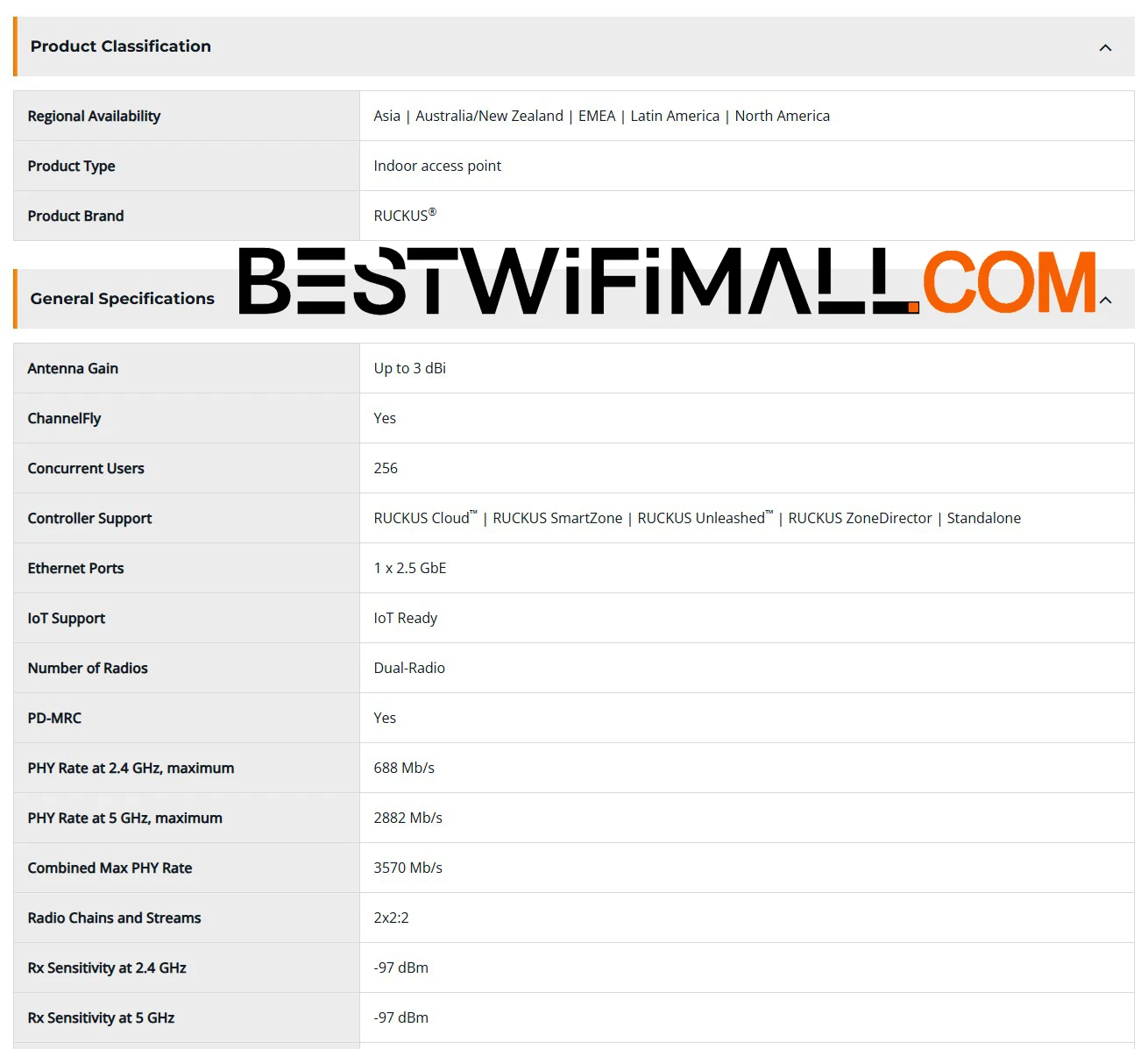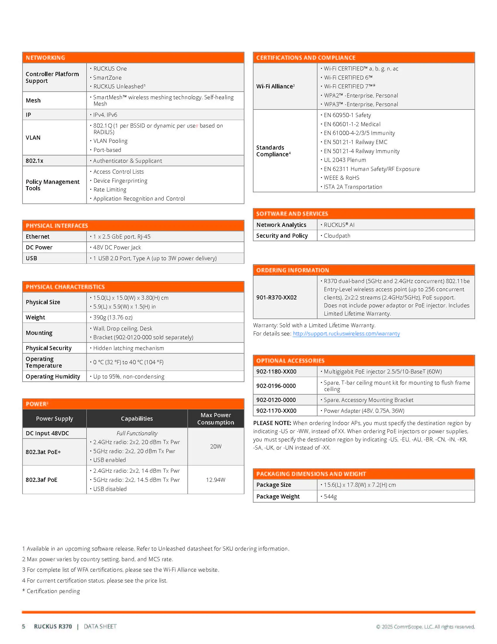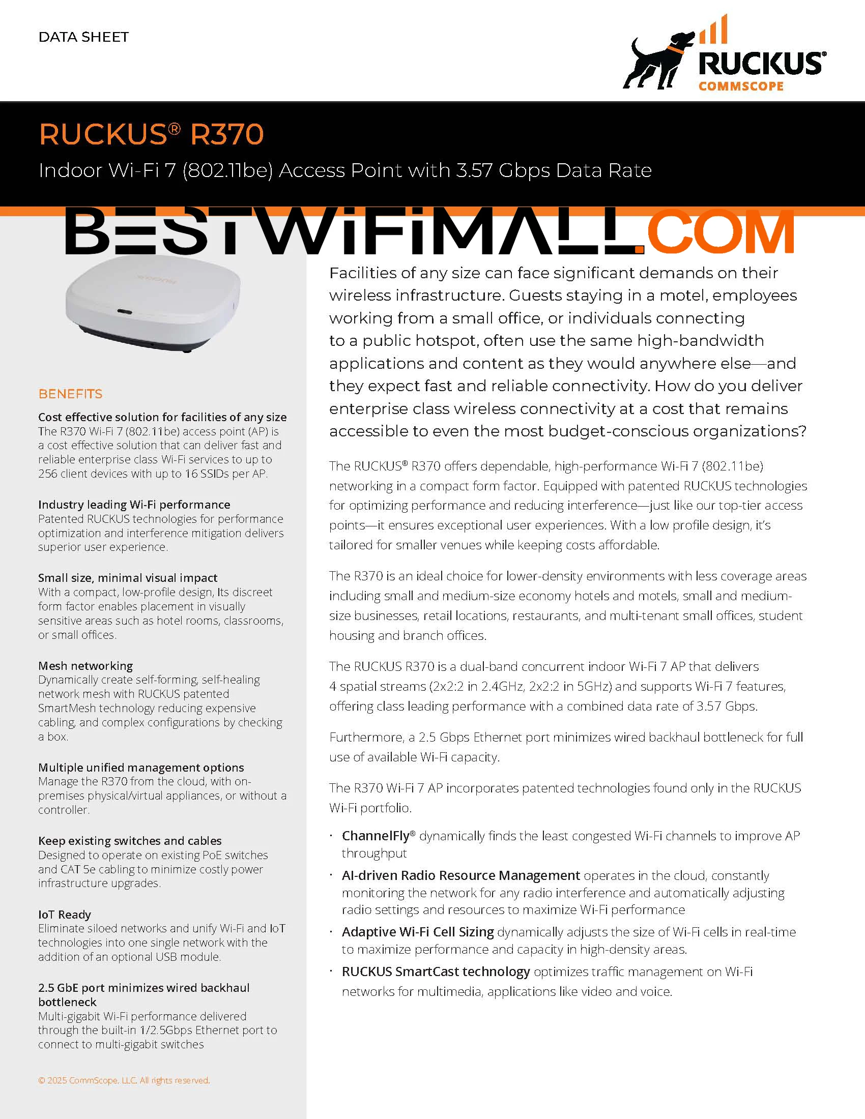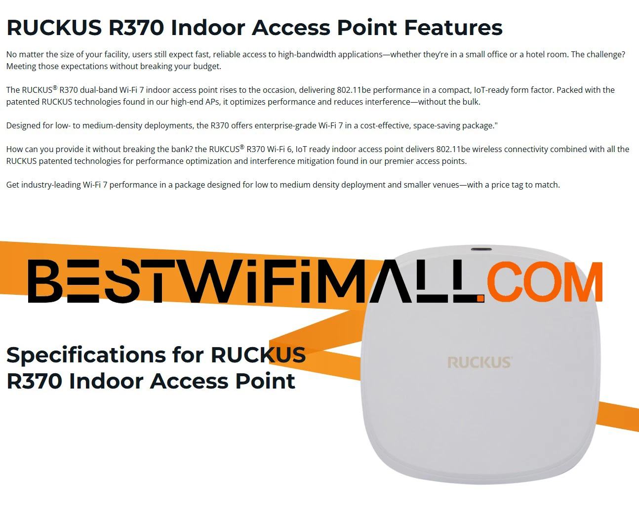 RUCKUS Networks R370 901-R370-WW02 901-R370-EU02 901-R370-US02 Indoor Wireless Access Point Entry-Level Wi-Fi 7 802.11be AP 2x2:2 Indoor Access Point 3.57 Gbps, IoT Ready